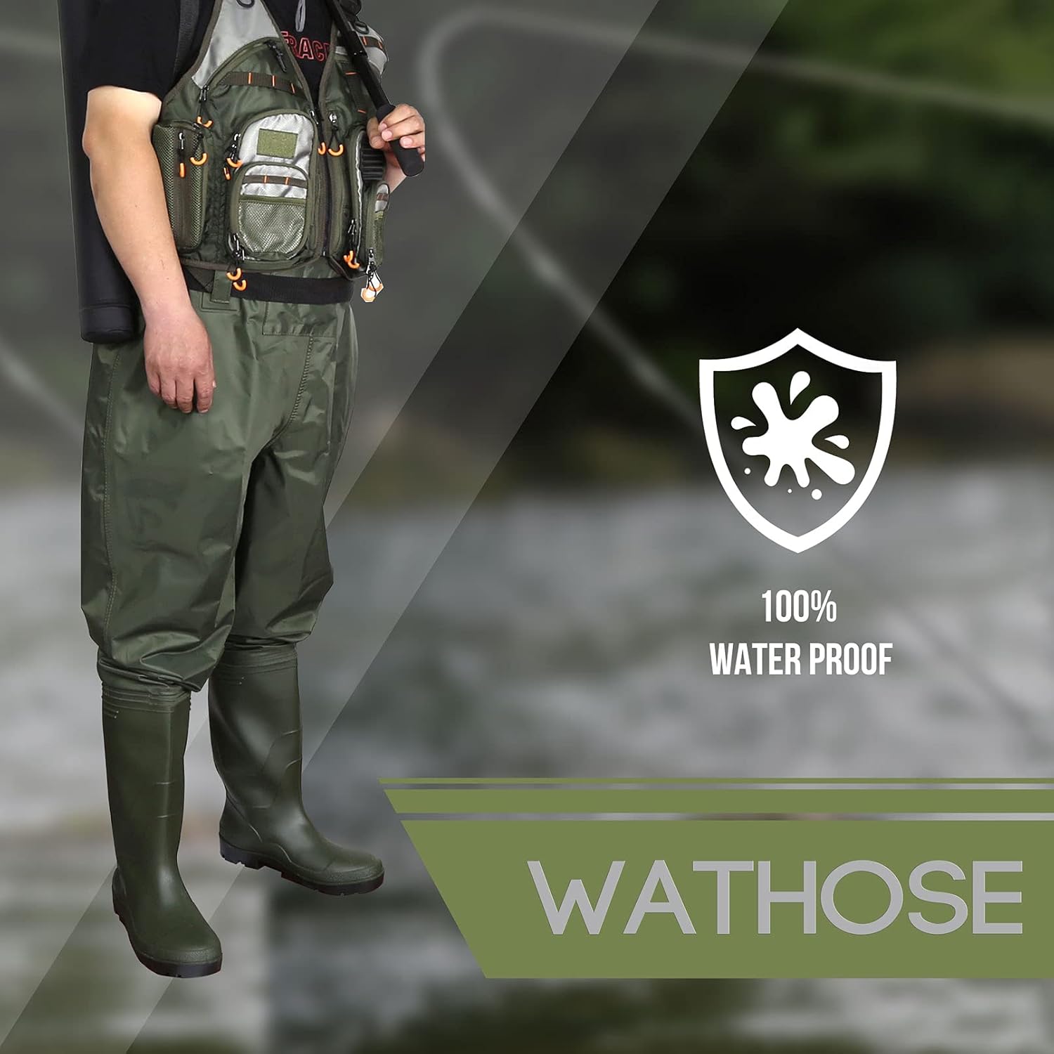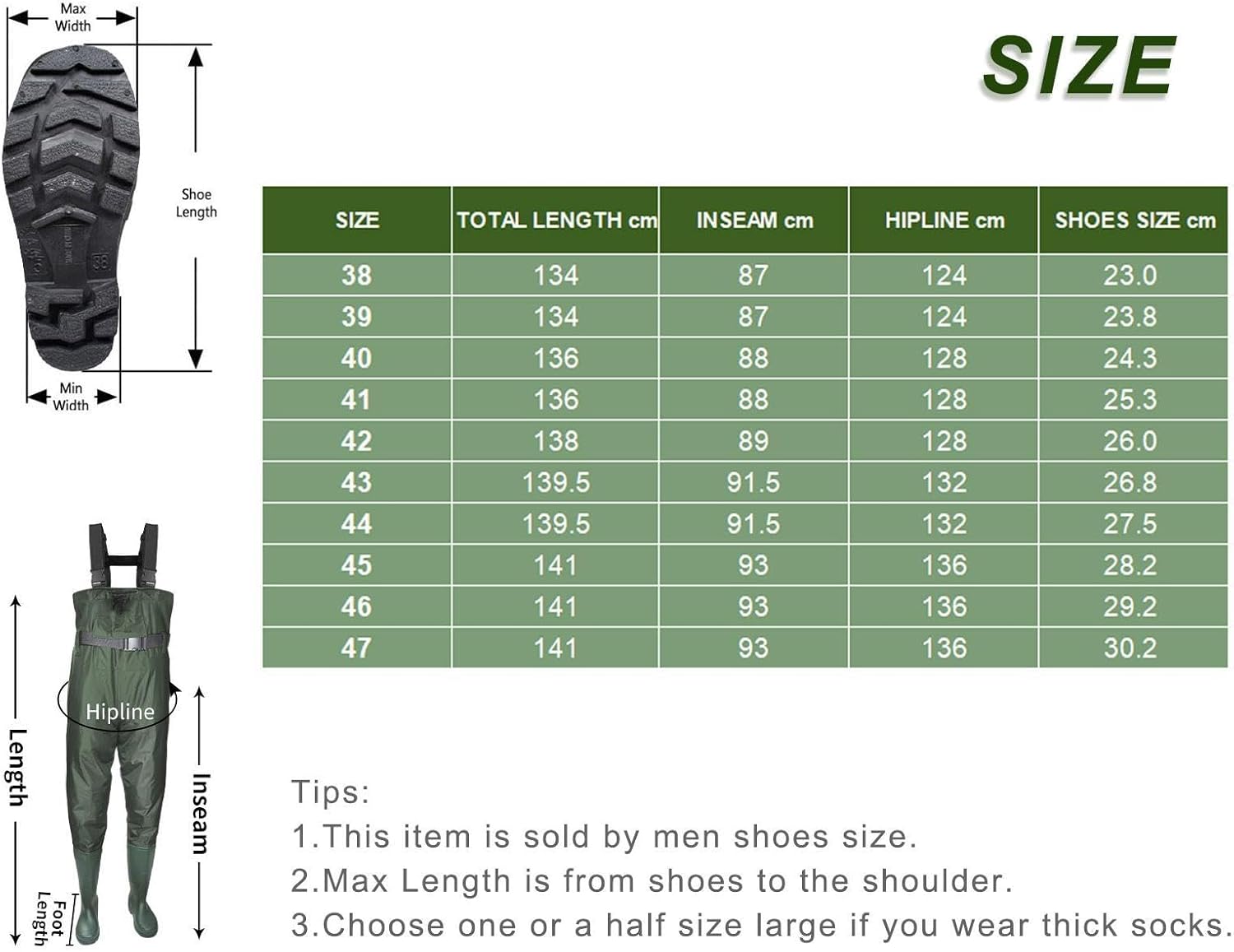 - Wasserdicht Wathose - Hochwertige PVC- und Nylonmaterialien, abgestimmt mit Gummistiefeln und dann verwendet Fortschrittliche Bonding-Technologie, eine perfekte Kombination aus Material und Technologie, macht diese Wathose absolut wasserdicht. Sie können Ihre Hosen und Socken trocken halten.