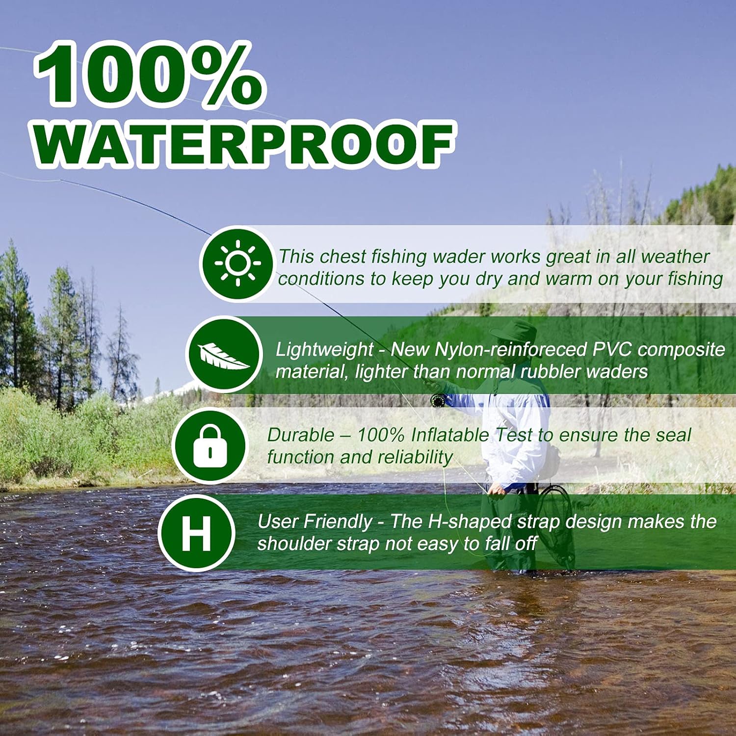 - Wasserdicht Wathose - Hochwertige PVC- und Nylonmaterialien, abgestimmt mit Gummistiefeln und dann verwendet Fortschrittliche Bonding-Technologie, eine perfekte Kombination aus Material und Technologie, macht diese Wathose absolut wasserdicht. Sie können Ihre Hosen und Socken trocken halten.