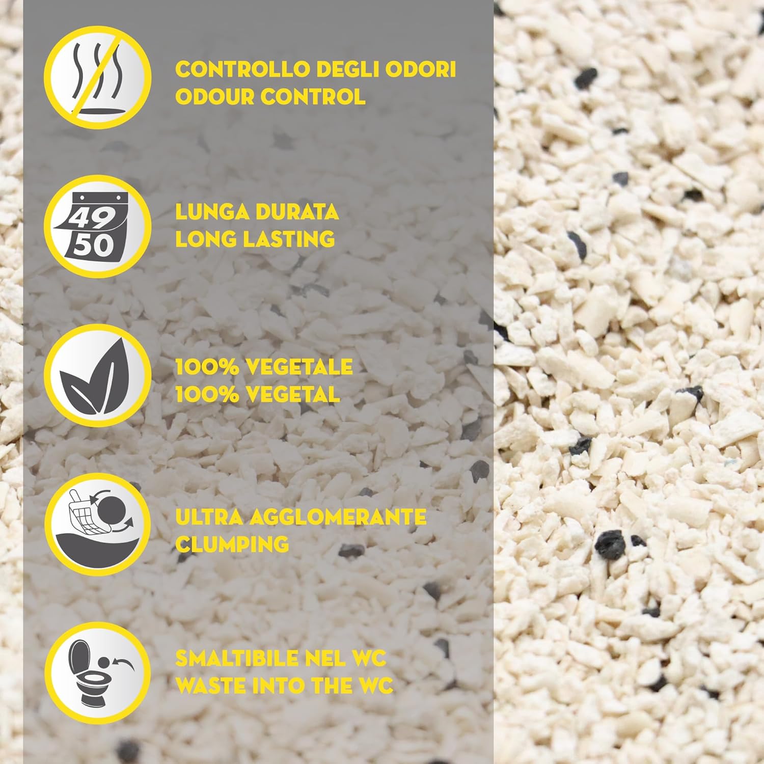 - Agglomerant: Die Klumpwirkung der Pflanzenfasern hält Flüssigkeiten zurück und schafft einen kompakten Ball, der leicht abnehmbar ist