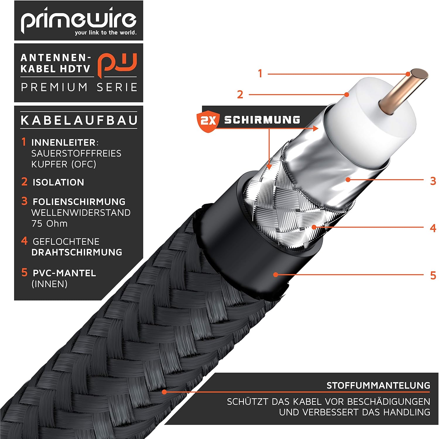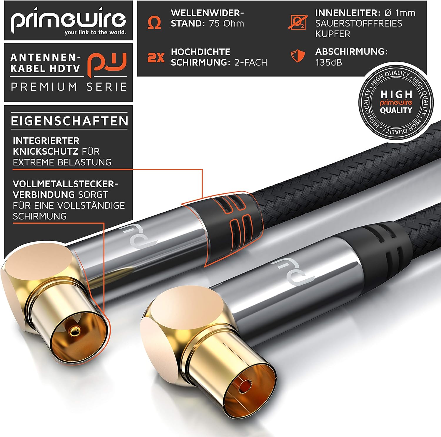 • Modellbezeichnung: Primewire Premium TV-Antennenkabel. Koax-Stecker mit Winkel (90°) auf Koax-Buchse mit Winkel (90°). | Überträgt analoge und digitale Signale wie DVB-T und DVB-T2, Radio (UKW/ DAB / DAB+) sowie Kabelfernsehen analog/digital HD/4k