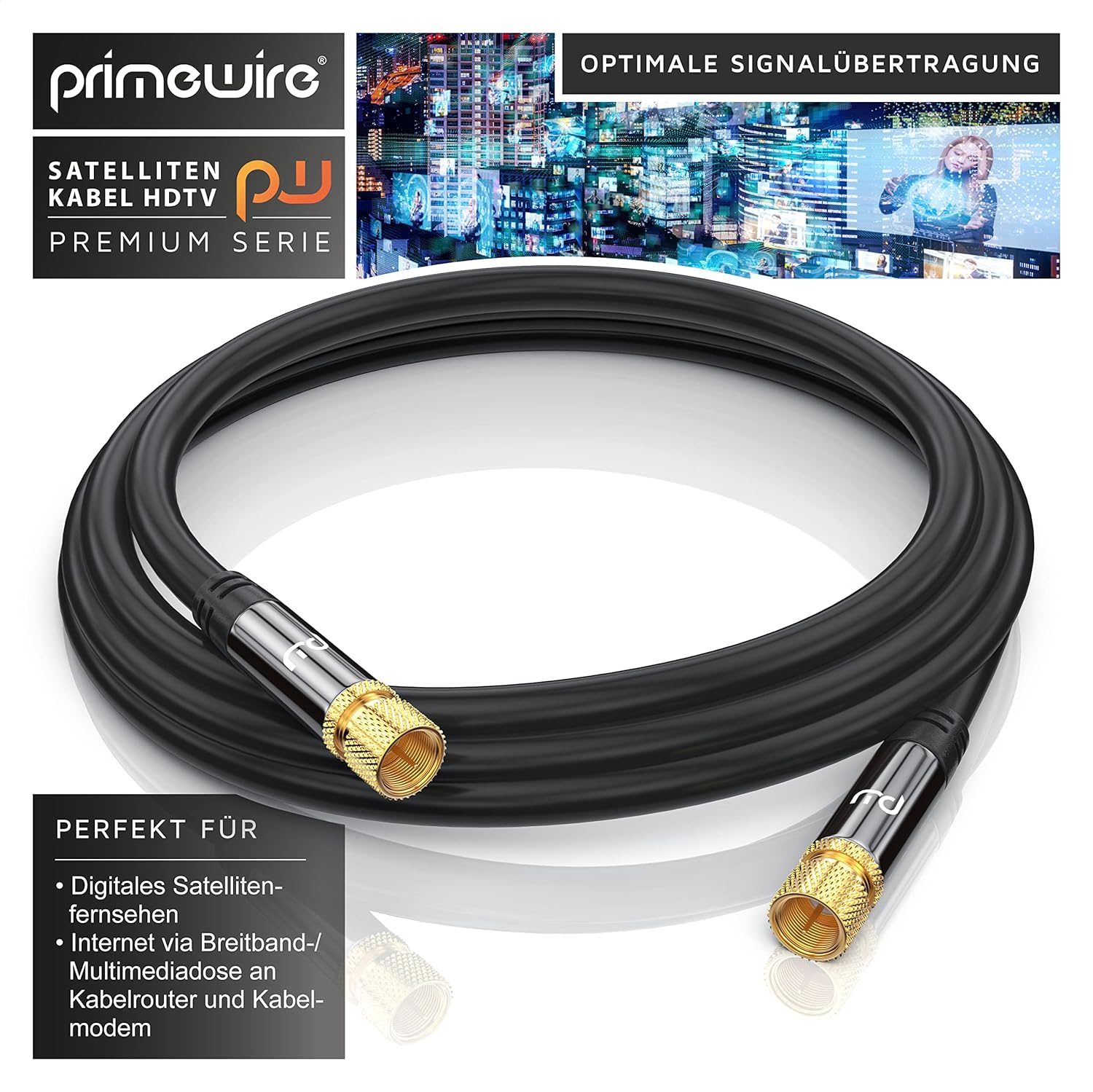 - Modellbezeichnung: Primewire 10,0m Premium TV Satellitenkabel / F-Stecker (male) zu F-Stecker (male) | Übertragung von analogen und digitalen Signalen sowie DVB-S, DVB-S2 und Kabelinternet | stellt eine zuverlässige Verbindung zwischen Anschluss-/