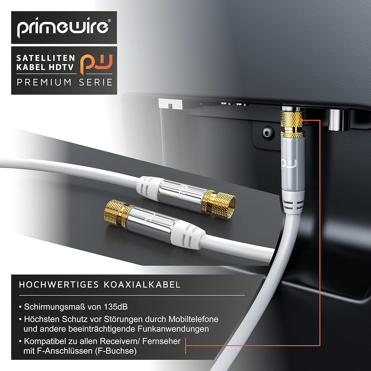 - Modellbezeichnung: Primewire 12,5m Premium TV Satellitenkabel / F-Stecker (male) zu F-Stecker (male) | Übertragung von analogen und digitalen Signalen sowie DVB-S, DVB-S2 und Kabelinternet | stellt eine zuverlässige Verbindung zwischen Anschluss-/