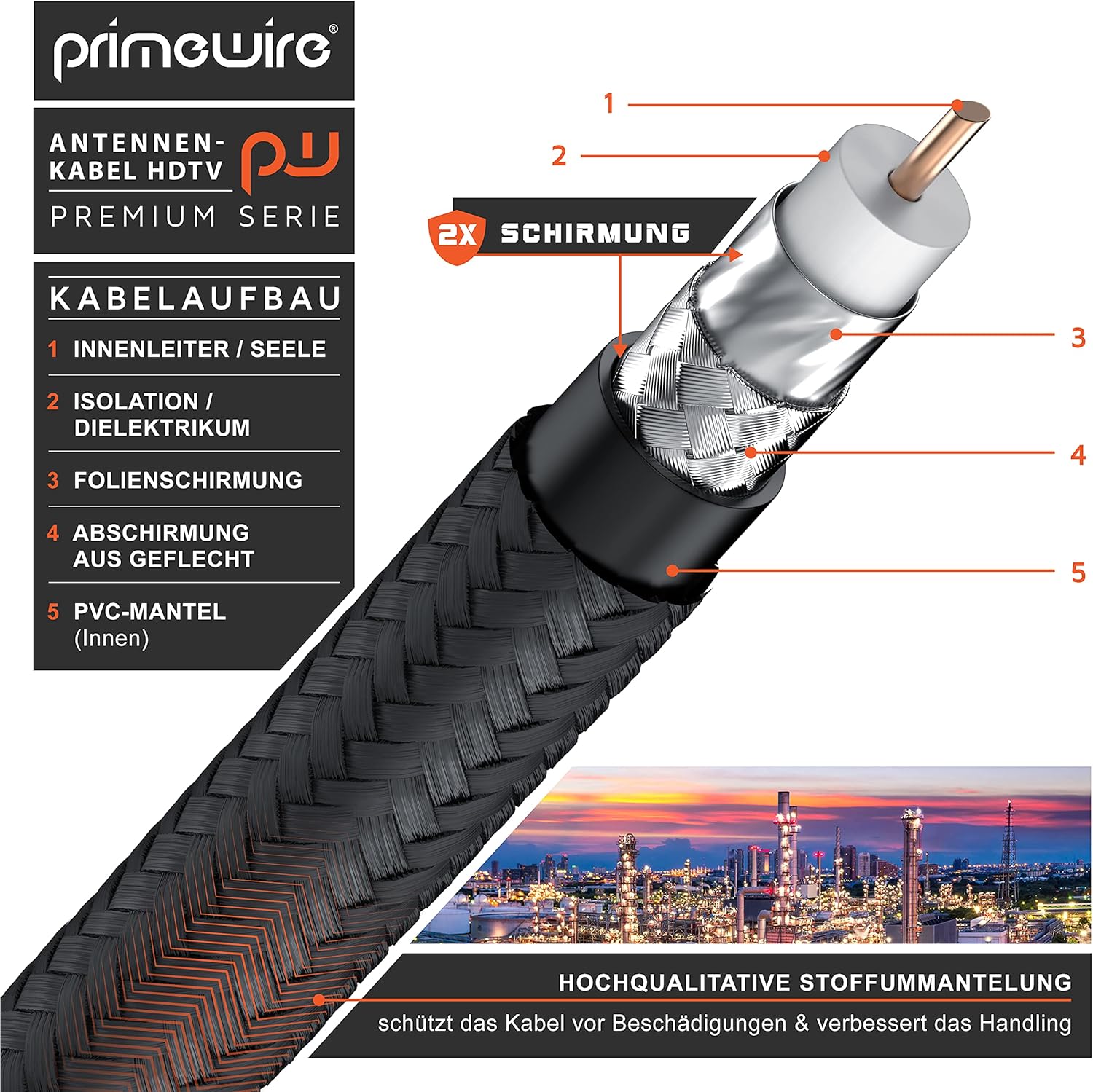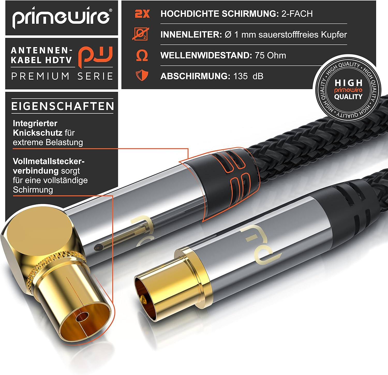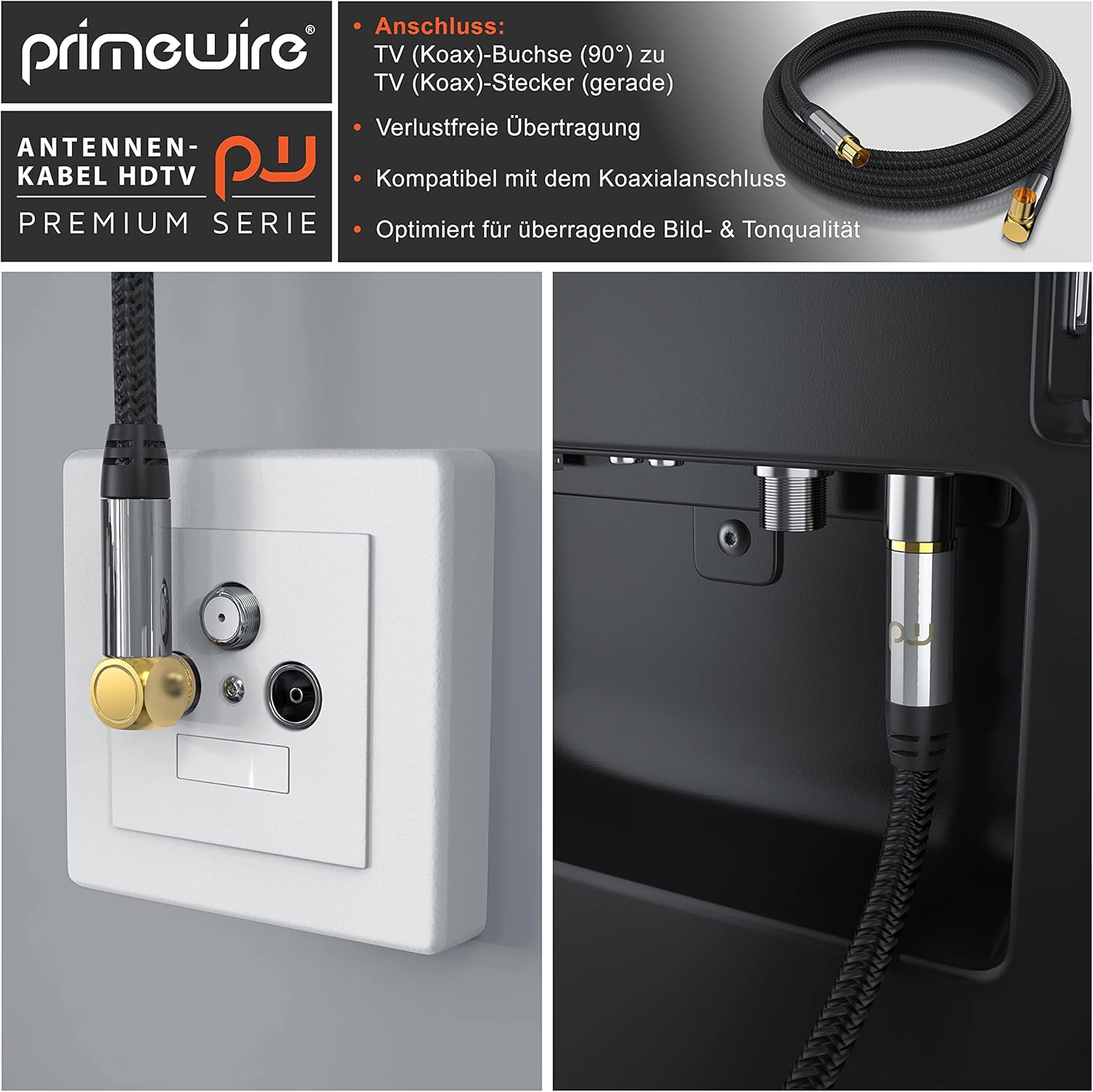 - Primewire Premium TV-Antennenkabel. Koax-Buchse Winkel auf Koax-Stecker gerade. | Überträgt analoge und digitale Signale wie DVB-T und DVB-T2, Radio (UKW/ DAB / DAB+) sowie Kabelfernsehen analog/digital HD/4k UHD I | Stellt eine zuverlässige