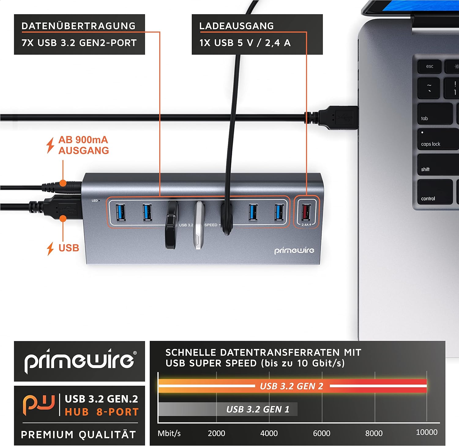 - 7 x Datenports und 1 x Ladepower: Der Primewire 8 Port USB-Hub erweitert eine einzige USB 3.2. Gen.2-Schnittstelle um 7 Datensteckplätze und einen PowerPort! Ideal für alle Windows Desktop-PCs, Notebooks, Laptops sowie Macbooks, Mac Mini und iMac (Pro)