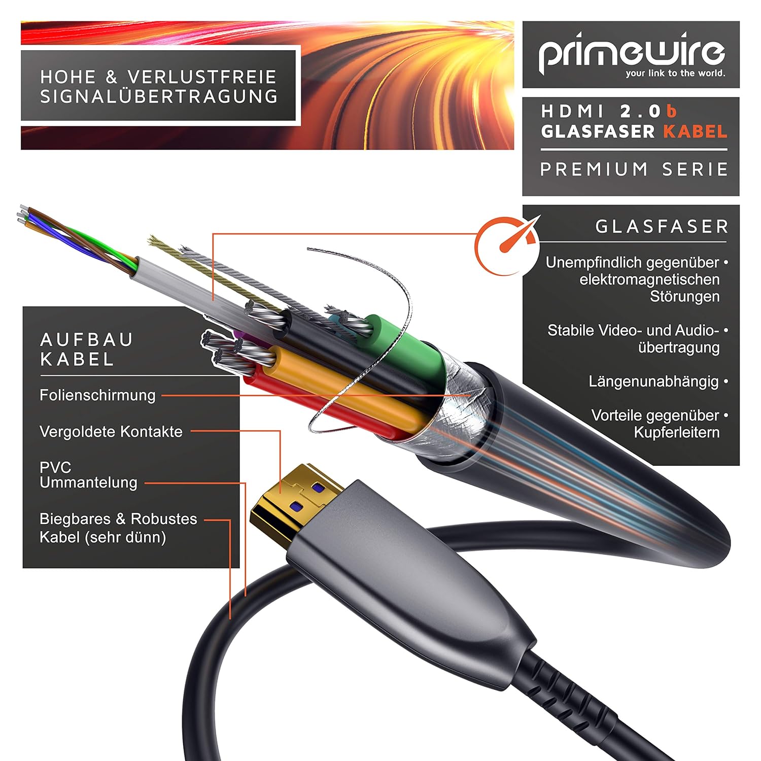 - Wenn Daten über viele Meter hinweg verlustfrei übertragen werden sollen, spielt das Primewire HDMI Glasfaserkabel seine Stärken voll aus. Denn im Vergleich zu Kupferleitungen ist es ganz und gar unempfindlich gegenüber elektromagnetischen Störungen.