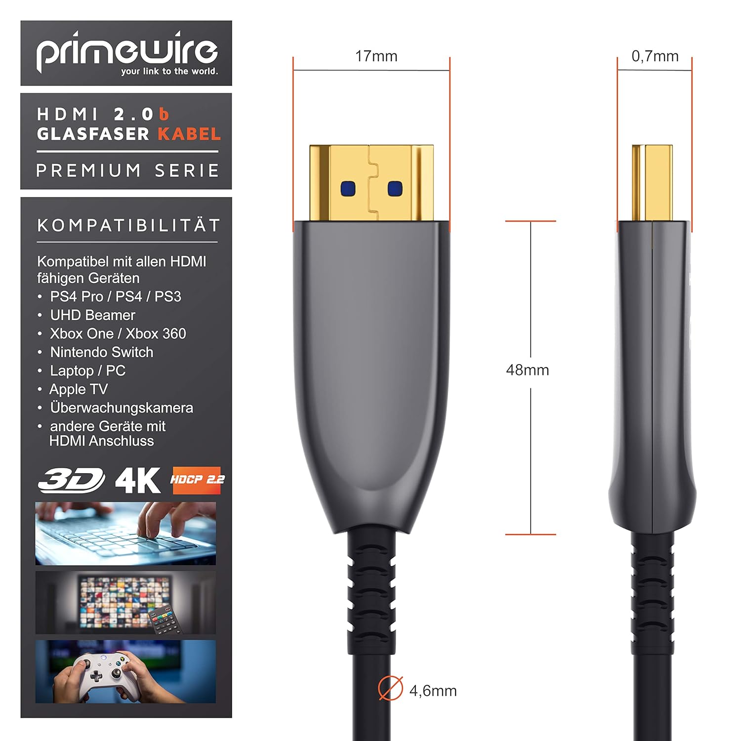 - Wenn Daten über viele Meter hinweg verlustfrei übertragen werden sollen, spielt das Primewire HDMI Glasfaserkabel seine Stärken voll aus. Denn im Vergleich zu Kupferleitungen ist es ganz und gar unempfindlich gegenüber elektromagnetischen Störungen.