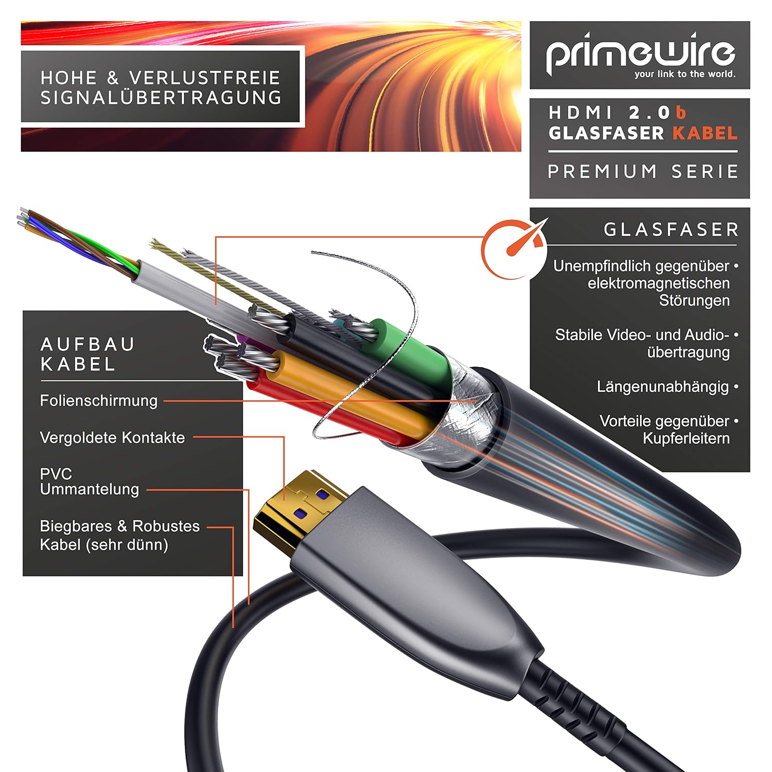 - Wenn Daten über viele Meter hinweg verlustfrei übertragen werden sollen, spielt das Primewire HDMI Glasfaserkabel seine Stärken voll aus. Denn im Vergleich zu Kupferleitungen ist es ganz und gar unempfindlich gegenüber elektromagnetischen Störungen.