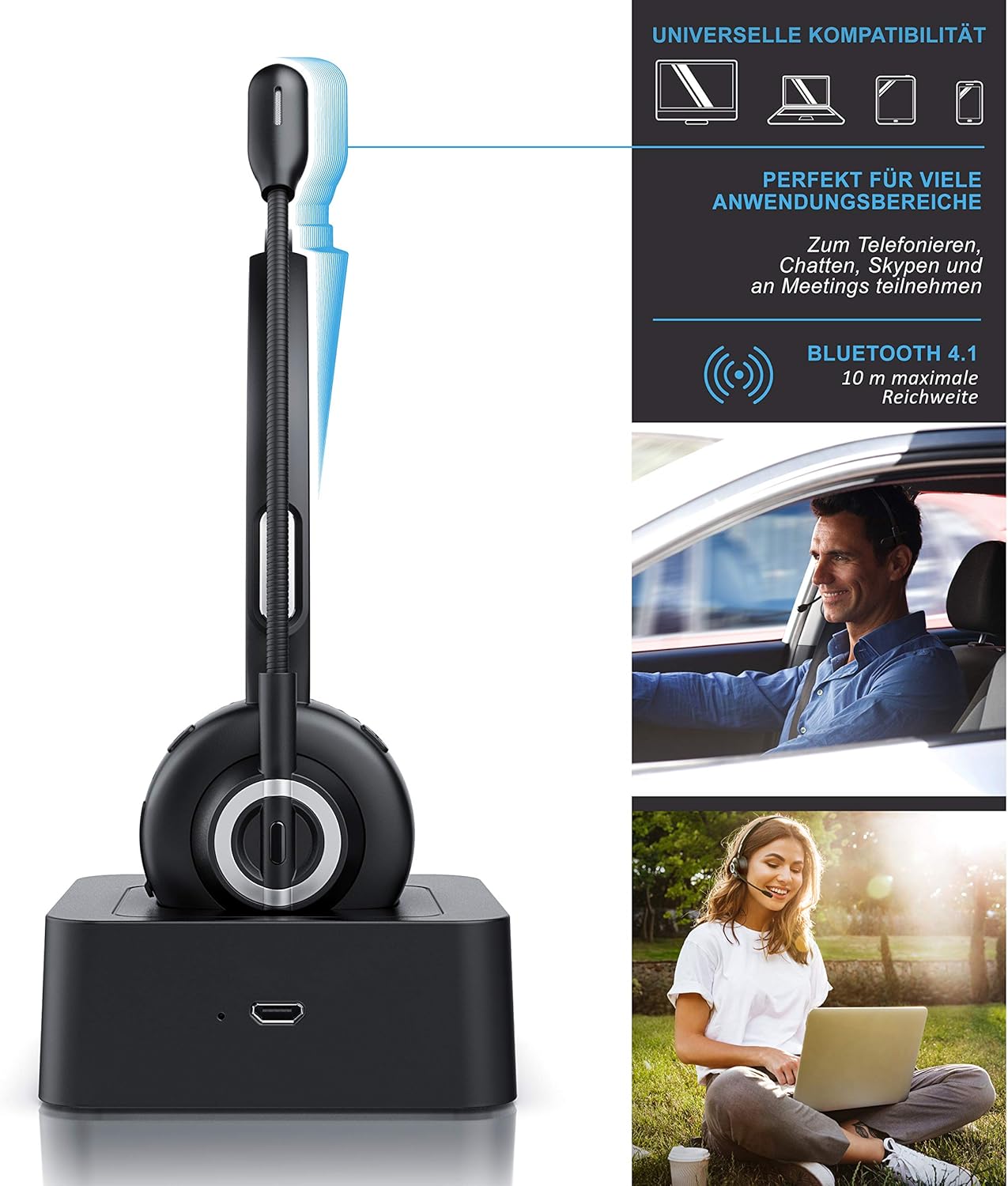 - Drahtloses Bluetooth 4.1 Headset mit Ladestation. Mehr als 18 Stunden Sprechzeit. Geeignet für Computer und Smartphones (Android, iPhone) über Skype, im Callcenter oder bei Meetings. Die Bluetooth A2DP-Technologie erlaubt das gleichzeitige Anschliessen von 2 Geräten. | 303455
