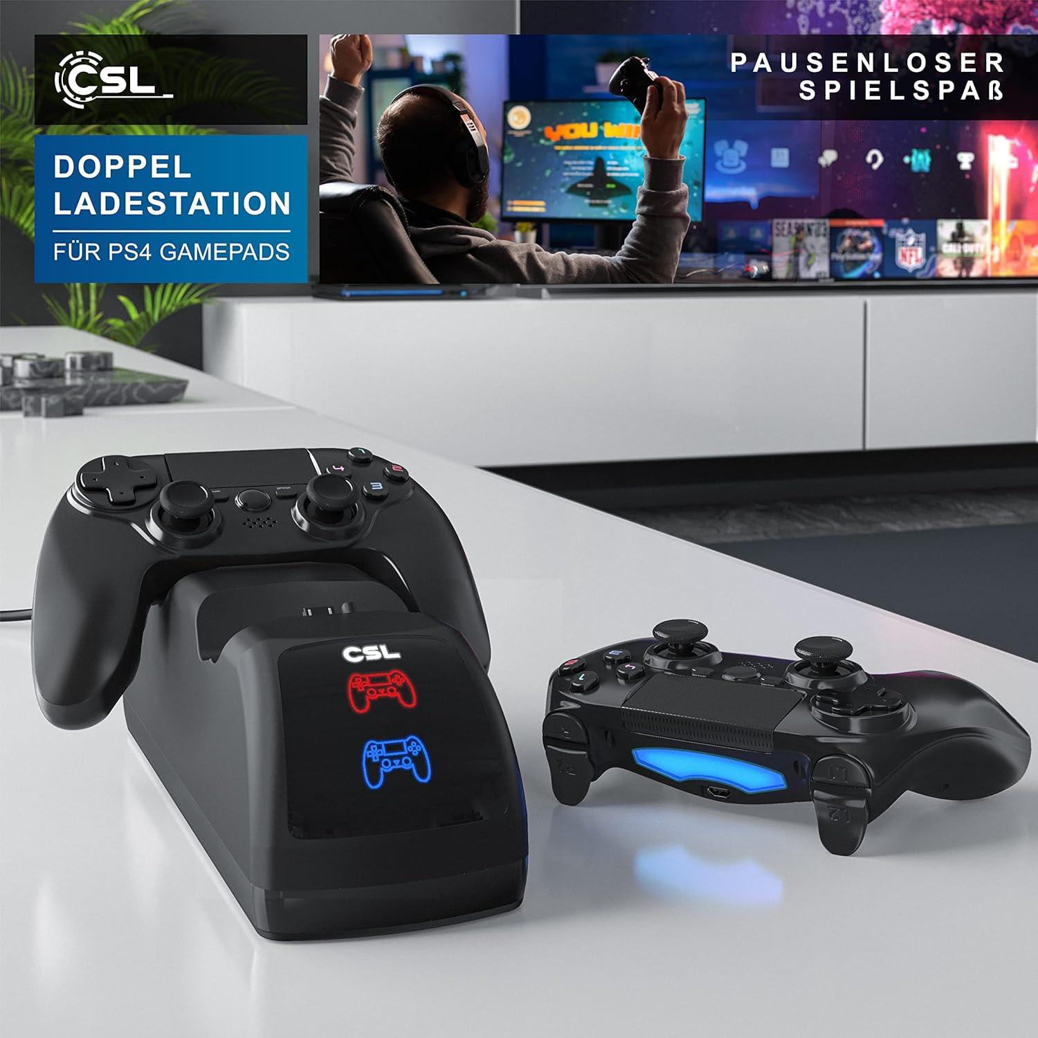 - Nutzen Sie Ihr CSL Ladegerät als Halterung für Ihre PS4 Controller. Das sieht nicht nur gut aus, sondern verschafft Ihnen einen aufgeräumten Look zum schnellen Auffinden der Controller! | Vier Anti-Rutsch-Pads halten das Ladegerät fest an Ort und