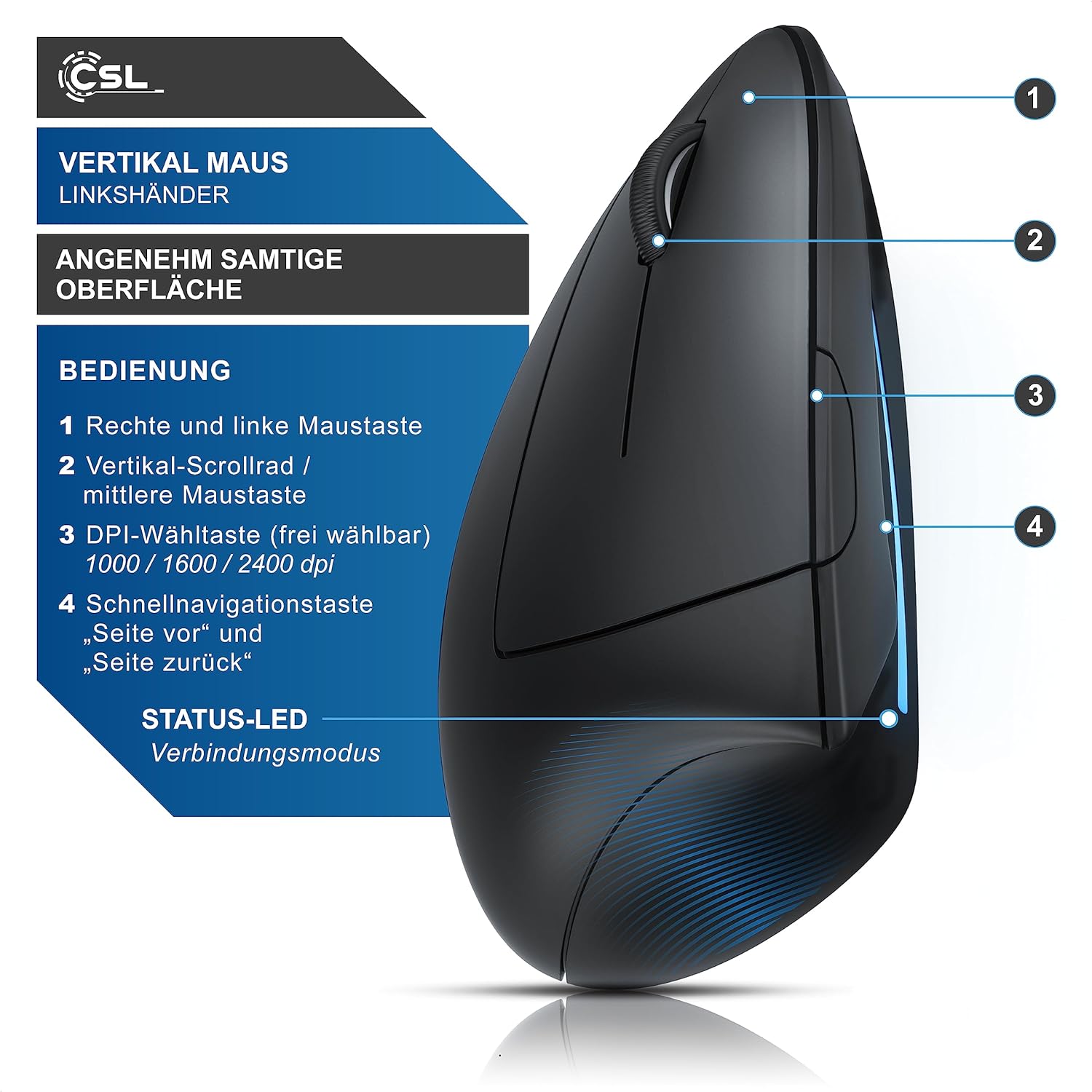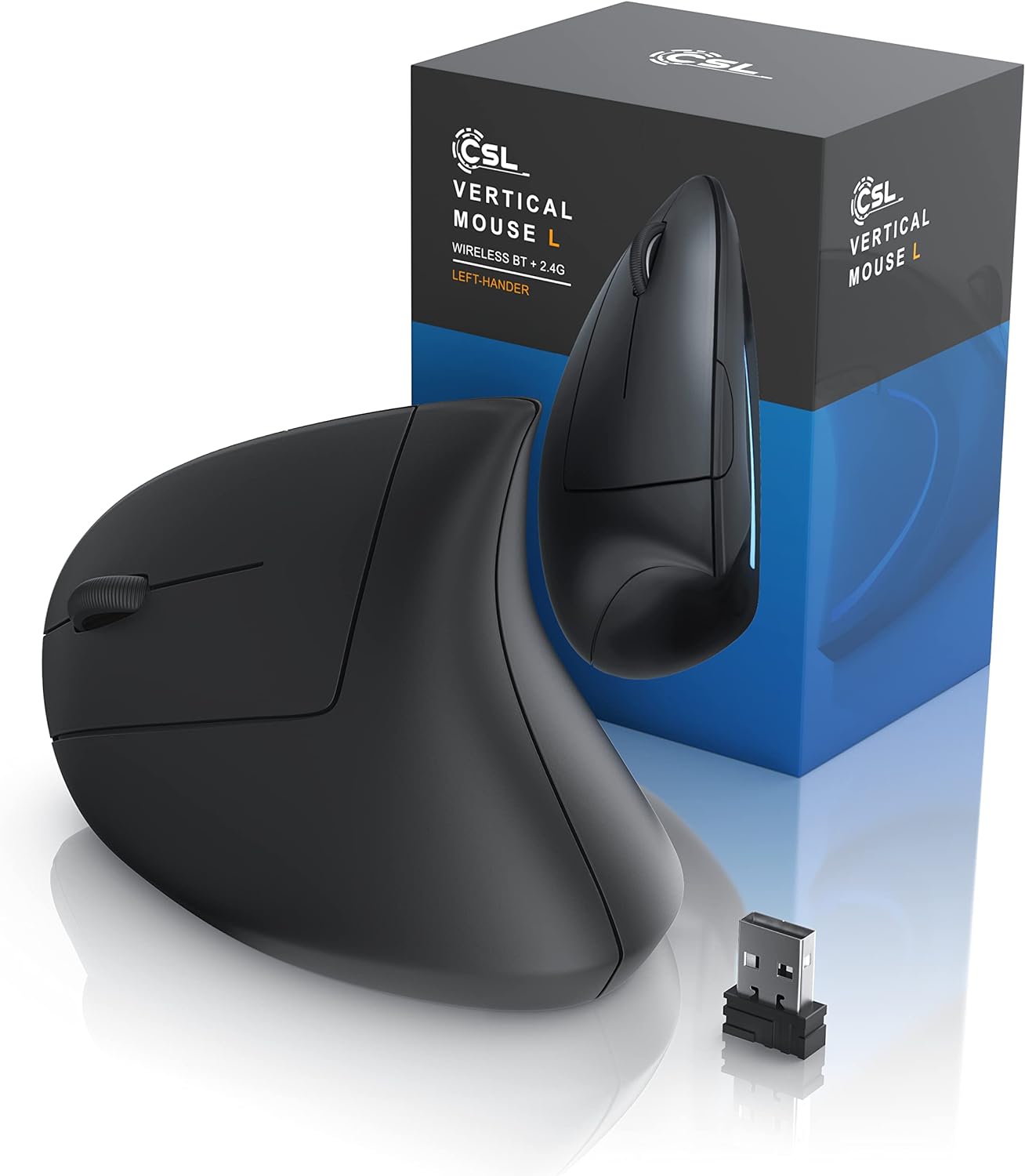 • CSL – WIRELESS VERTIKAL-MAUS MIT BLUETOOTH UND 2,4 GHZ FUNKVERBINDUNG | Konzipiert exklusiv für Linkshänder | Besonders armschonend, reduziert bzw. verhindert ein RSI-Syndrom. Empfohlen für alle User, die häufig am Computer bzw. Notebook arbeiten.