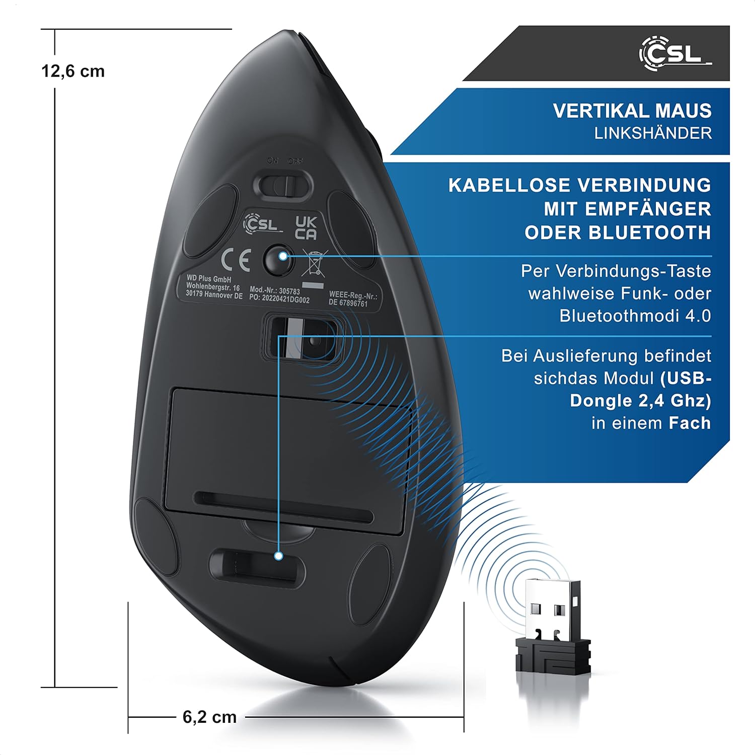 • ABMESSUNGEN: 6,2 x 6,8 x 12,6cm (H x B x T) | Gewicht: 115 g | Farbe: schwarz (matt) | KOMPATIBEL mit macOS 10.6 und höher, MS Windows 7 – 11, Linux. | LIEFERUMFANG: CSL optische Vertikal-Maus (Linkshänder)+ Batterien + Bedienungsanleitung