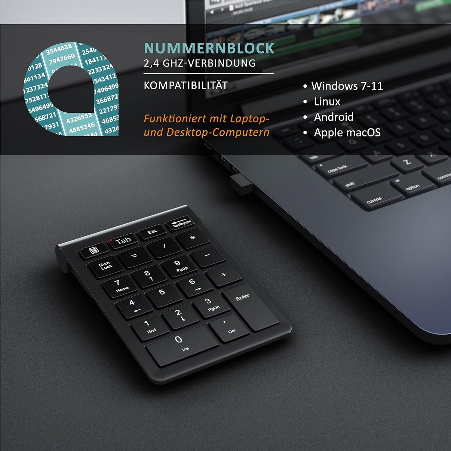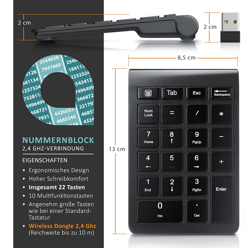 - KABELLOSER ZIFFERNBLOCK MIT 22 TASTEN. Die externe Funk-Tastatur erweitert Notebooks und Laptops um einen vollständigen Ziffernblock. 10 Multifunktionstasten für schnelles und komfortables Navigieren. Stabile 2,4 Ghz Funkverbindung per mitgeliefertem