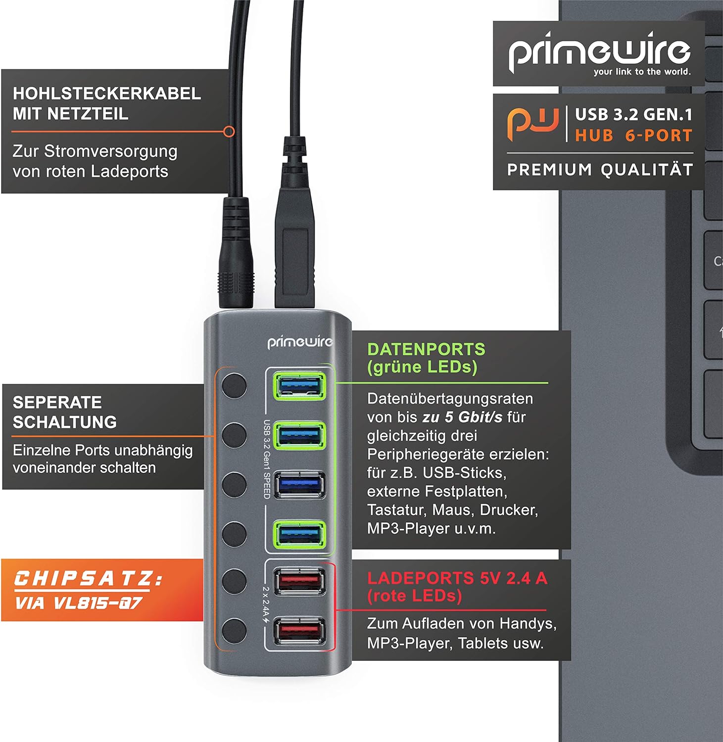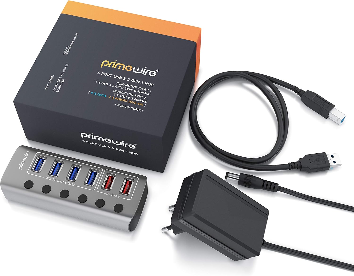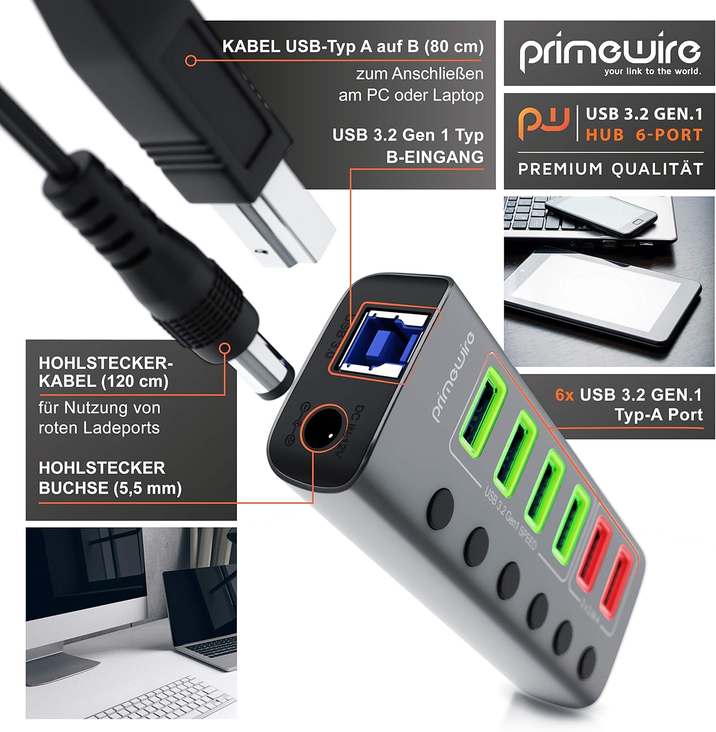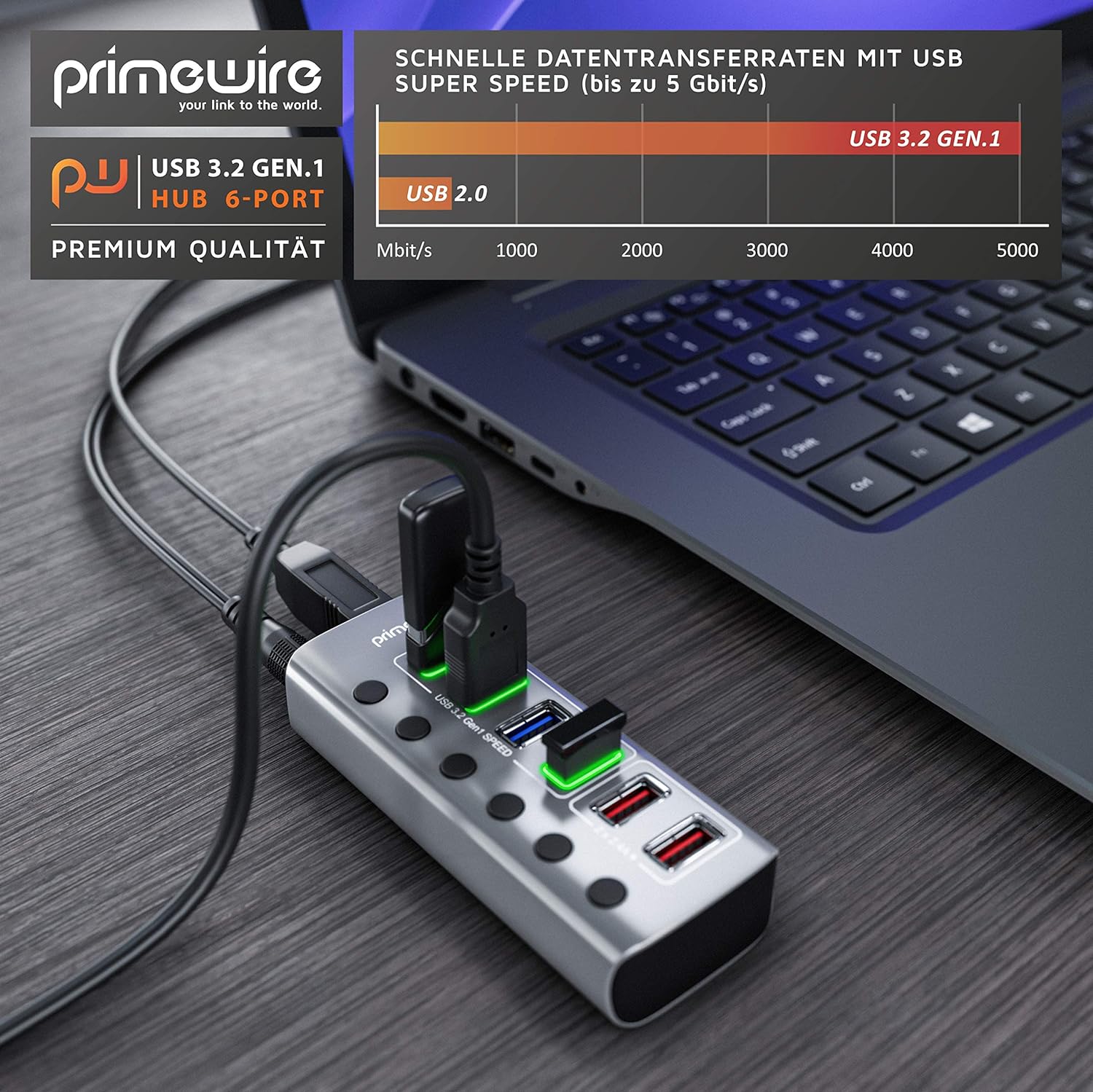 - Mehr Ports, mehr Ladepower: Der Primewire 6 Port USB-Hub erweitert eine einzige USB 3.2. Gen.1-Schnittstelle um vier Datensteckplätze und zwei PowerPorts! Ideal für alle Windows Desktop-PCs, Notebooks, Laptops sowie Macbooks (bis 2015), Mac Mini und