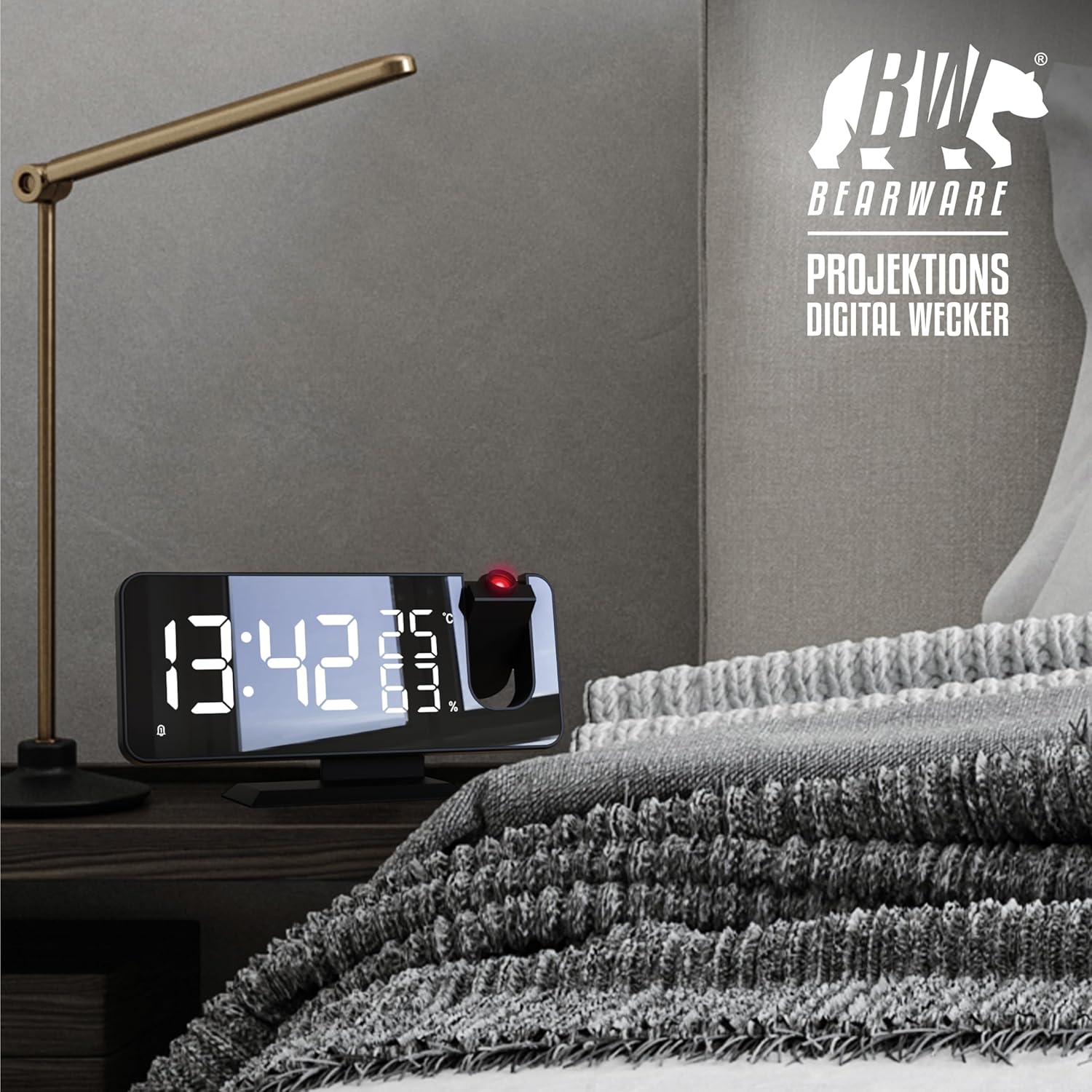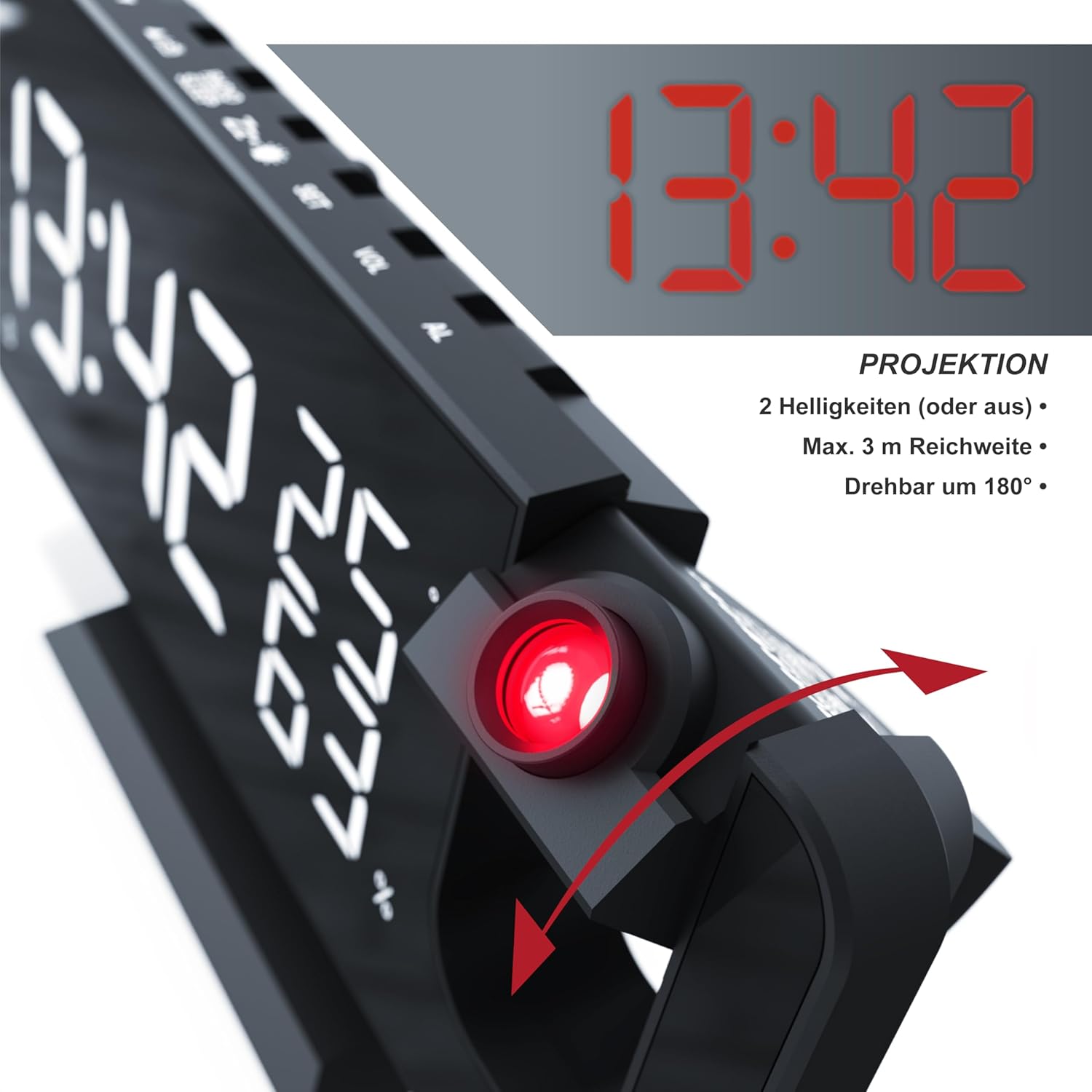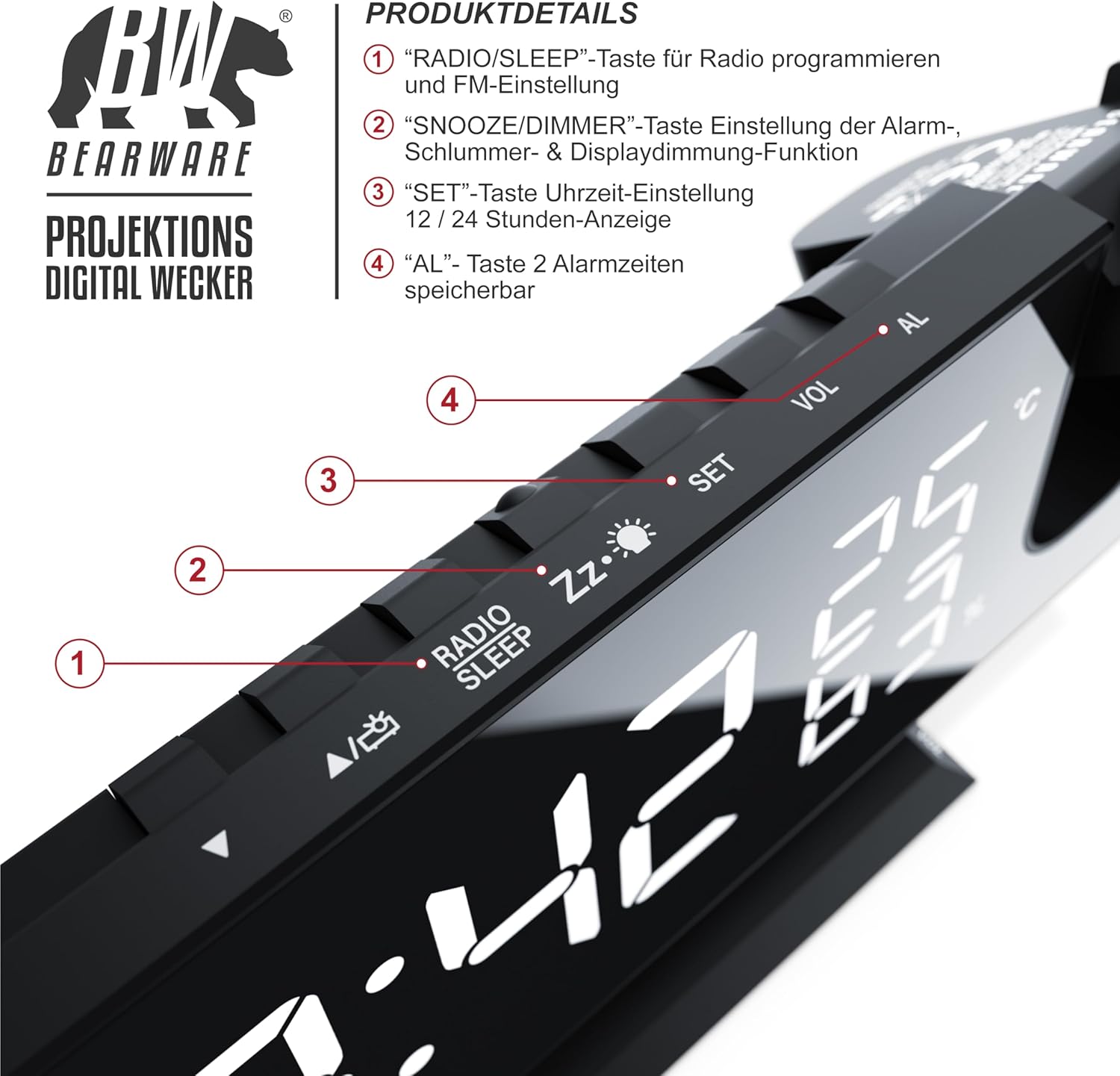 - EIN PROJEKTIONSWECKER MIT RUNDUM-AUSSTATTUNG. Seine 7-Tasten -Bedienung geht einfach von der Hand. Er bietet einen FM Radiowecker mit 15 Speicherplätzen und zwei unabhängig einstellbare Alarmzeiten. Die Anzeige kann in grossen Ziffern an die Wand