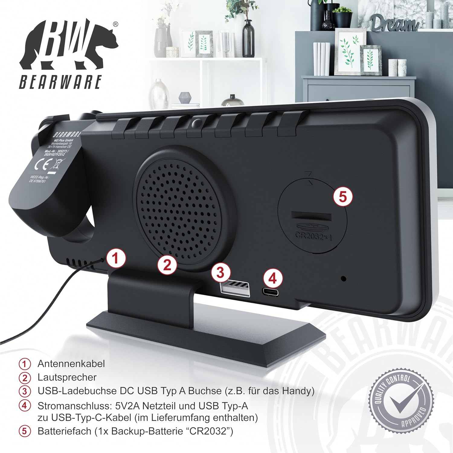 - TECHNISCHE DATEN: Spannungsversorgung: 5V2A DC (via USB Typ C); 3 V Backup-Batterie “CR2032”) | 5V Ladeausgang (USB Typ A) | Frequenzbereich: 87,5 Mhz – 108 Mhz | ABMESSUNGEN: Breite: 18 cm, Höhe: 9,7 cm, Tiefe: ca. 6 cm | GEWICHT: 214 g |