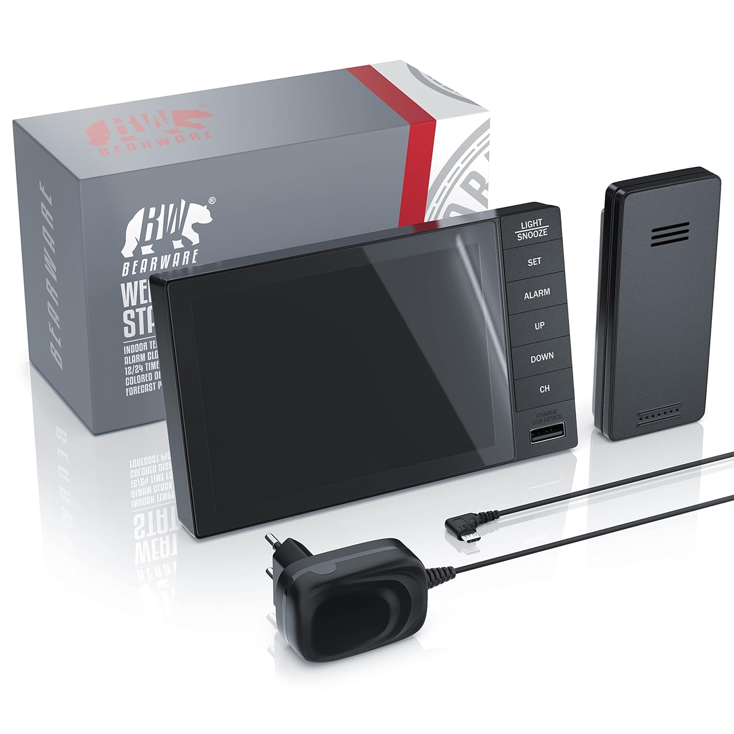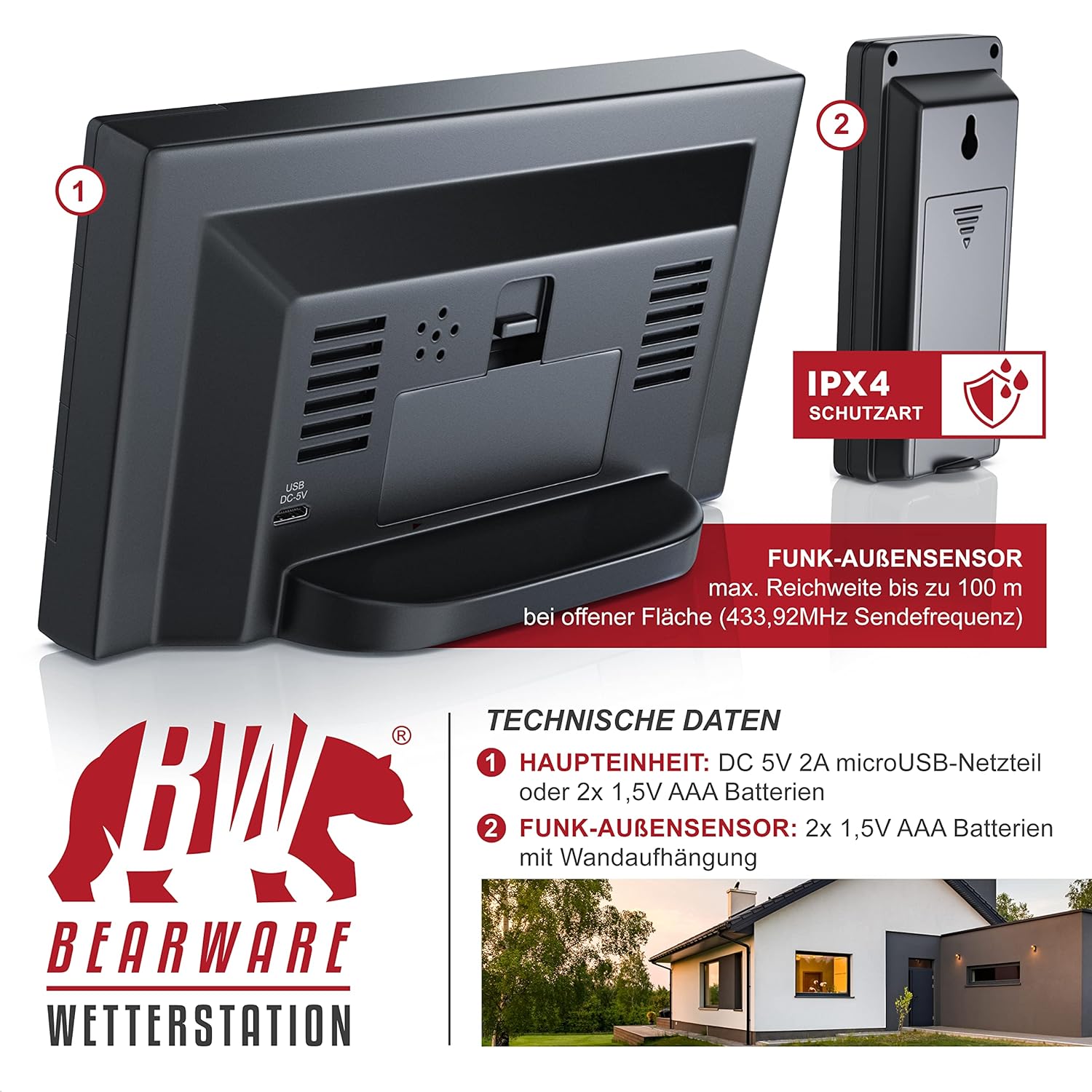 • ABMESSUNGEN: (BxHxT) 15,1 x 9 x 5 cm; Aussensensor: 100 x 45 x 18 mm | GEWICHT: 180 g (Wetterstation ohne Batterien) | LIEFERUMFANG: Bearware Wireless Wetterstation mit Funk-Aussensensor, Netzteil und Bedienungsanleitung