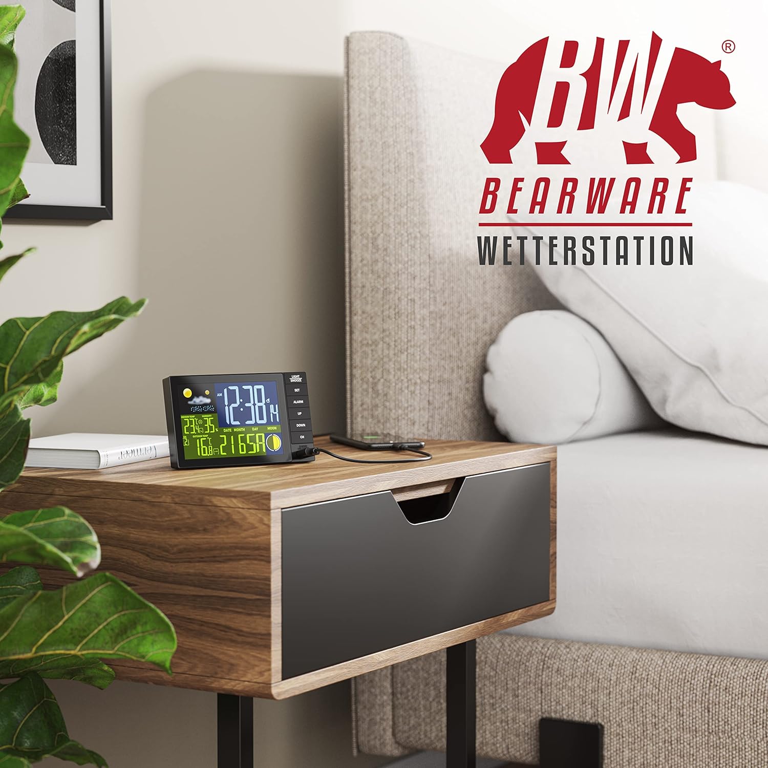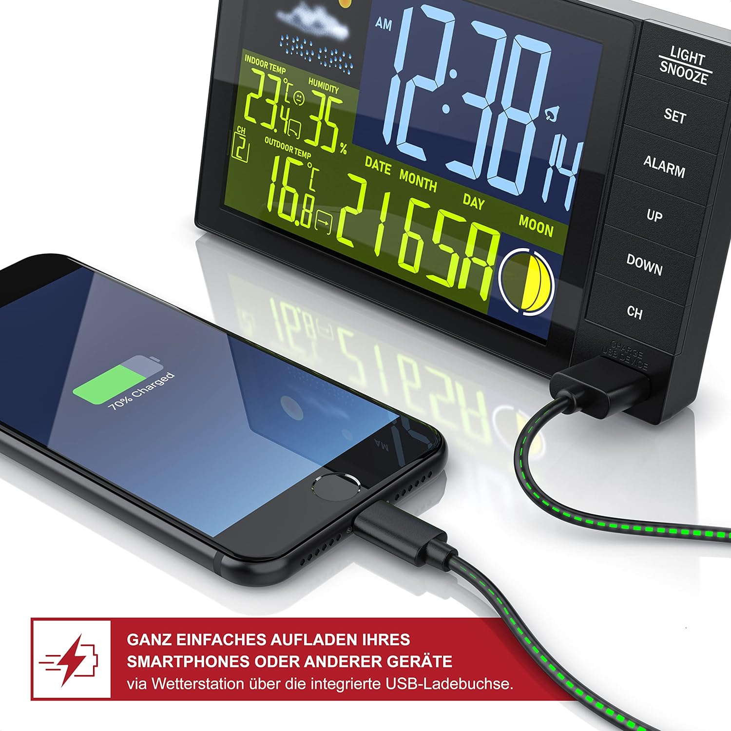 • MULTIFUNKTIONALE WETTERSTATION. Top-Ausstattung, die alles abdeckt. Temperatur und Luftfeuchtigkeit innen und aussen. Prognosefunktion. Wecker mit präziser DCF Uhrzeit, Alarm und Schlummertaste. USB Ladeausgang. Und ein logisch strukturiertes