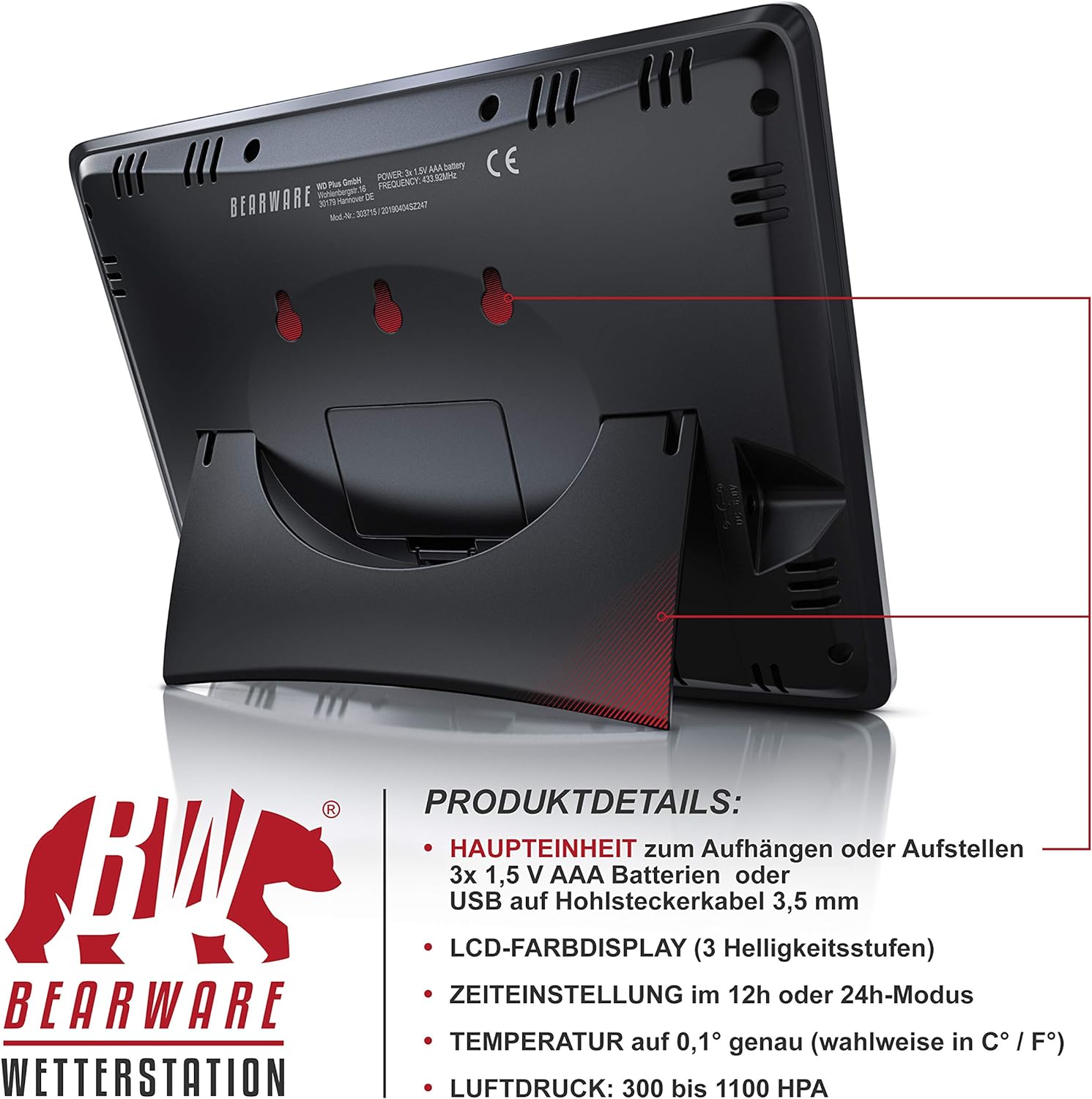 • Funktionen: Temperatur (°C oder °F) und Luftfeuchtigkeit im Innen- und Aussenbereich, mit abrufbaren Max/Min-Werten der letzten 24 Stunden | Datum und Uhrzeit | Alarm mit Schlummerfunktion | 12/24h Zeitformat einstellbar | Temperaturwarnung | Taupunktanzeige | Luftdruck in mmHg/hPa/inHg | Hintergrundbeleuchtung mit drei Helligkeitsstufen.