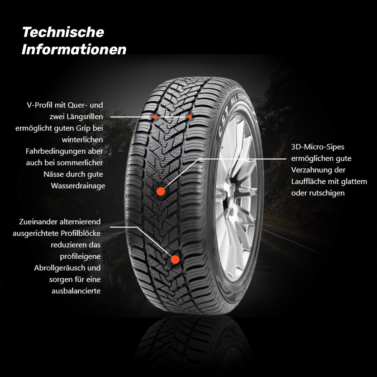- Beste Eigenschaften auch bei Nässe durch zwei grosse Längsrillen im Profil