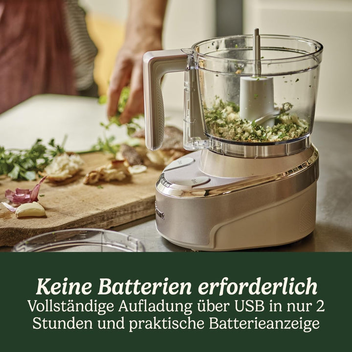 - Mini schnurloser Zerkleinerer mit Li-Ion-Akkus und USB-Ladegerät. Volle Ladung in 2 Stunden für 20 Minuten Dauerbetrieb