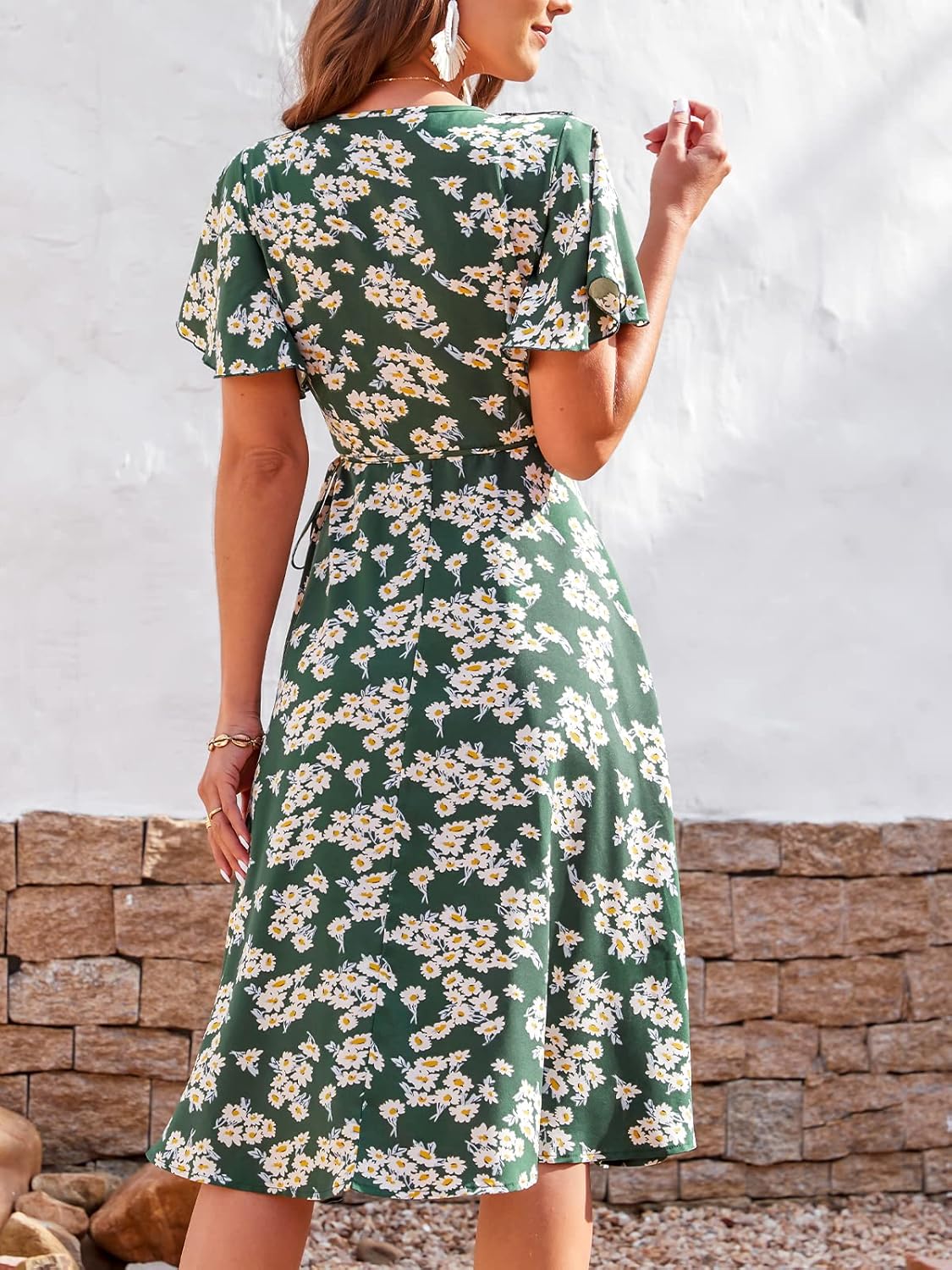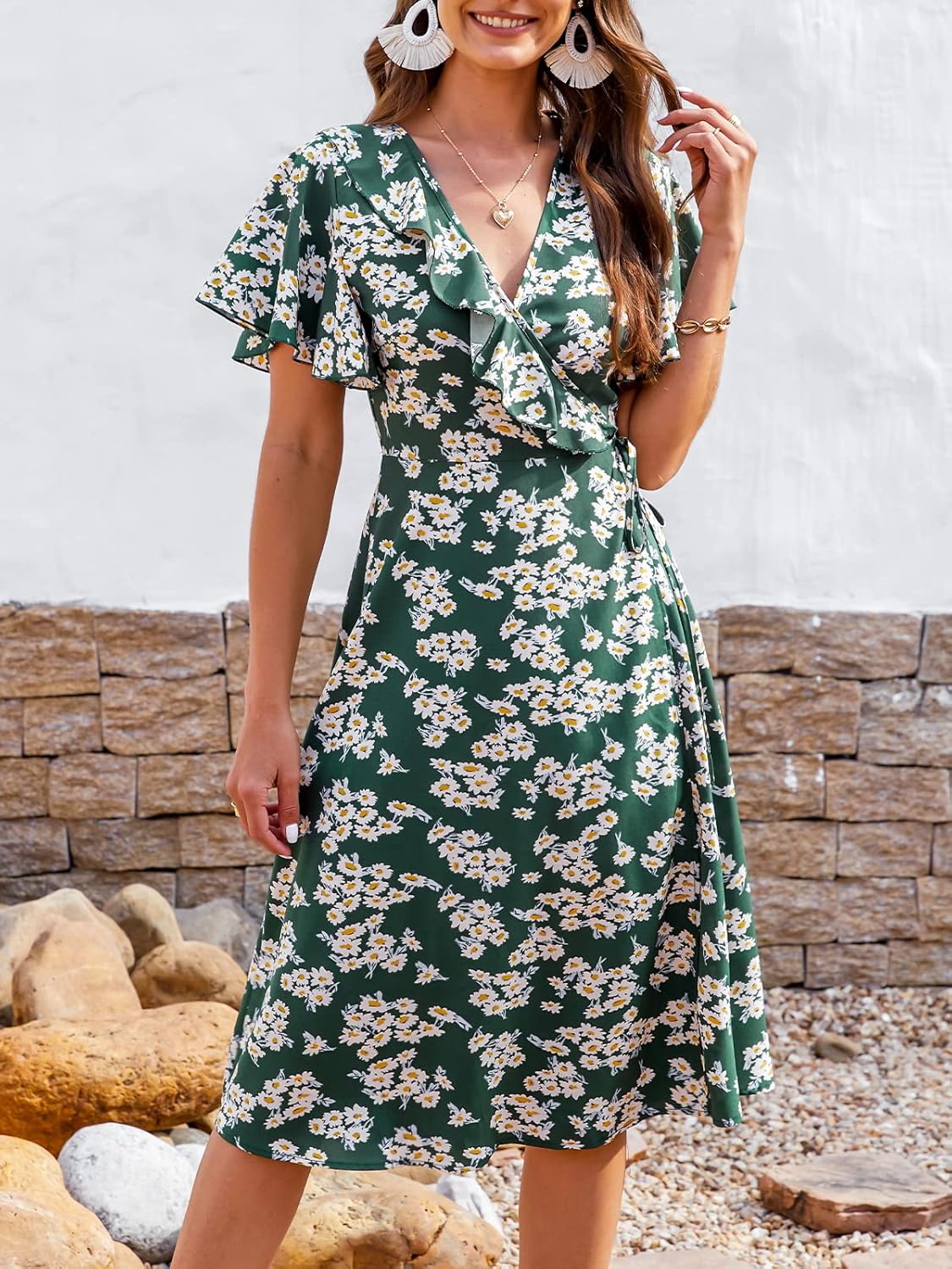 • ÜBER MICH: Romantisches Floral Wickelkleid, V Ausschnitt, Flatterärmeln, Kurze Ärmel, Elegantes Volantdetail um den Ausschnitt, In der Taille zu binden, Blumenmuster, Reguläre Passform