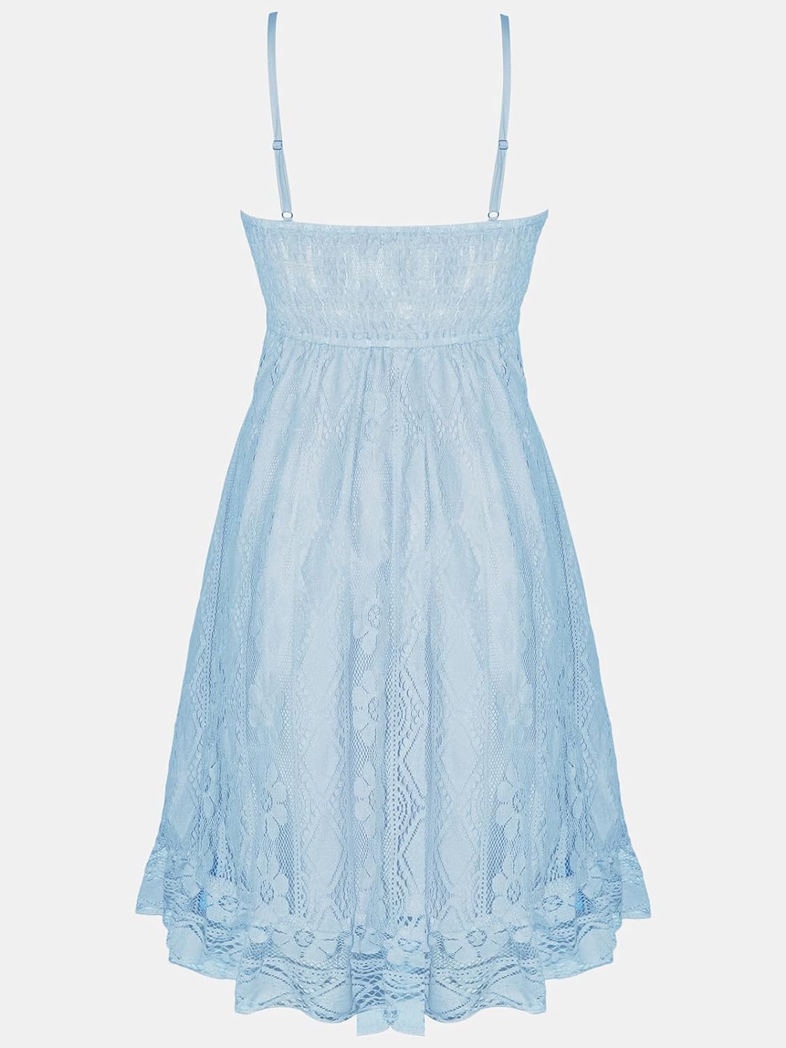 • ÜBER MICH: Floral Spitze Ausgestelltes Kleid, V Ausschnitt, Quastenverzierung, Verstellbare Spaghettiträger, Gesmokte Einsätze am Rücken, Zierausschnitte an der Taille, Minilänge, Reguläre Passform