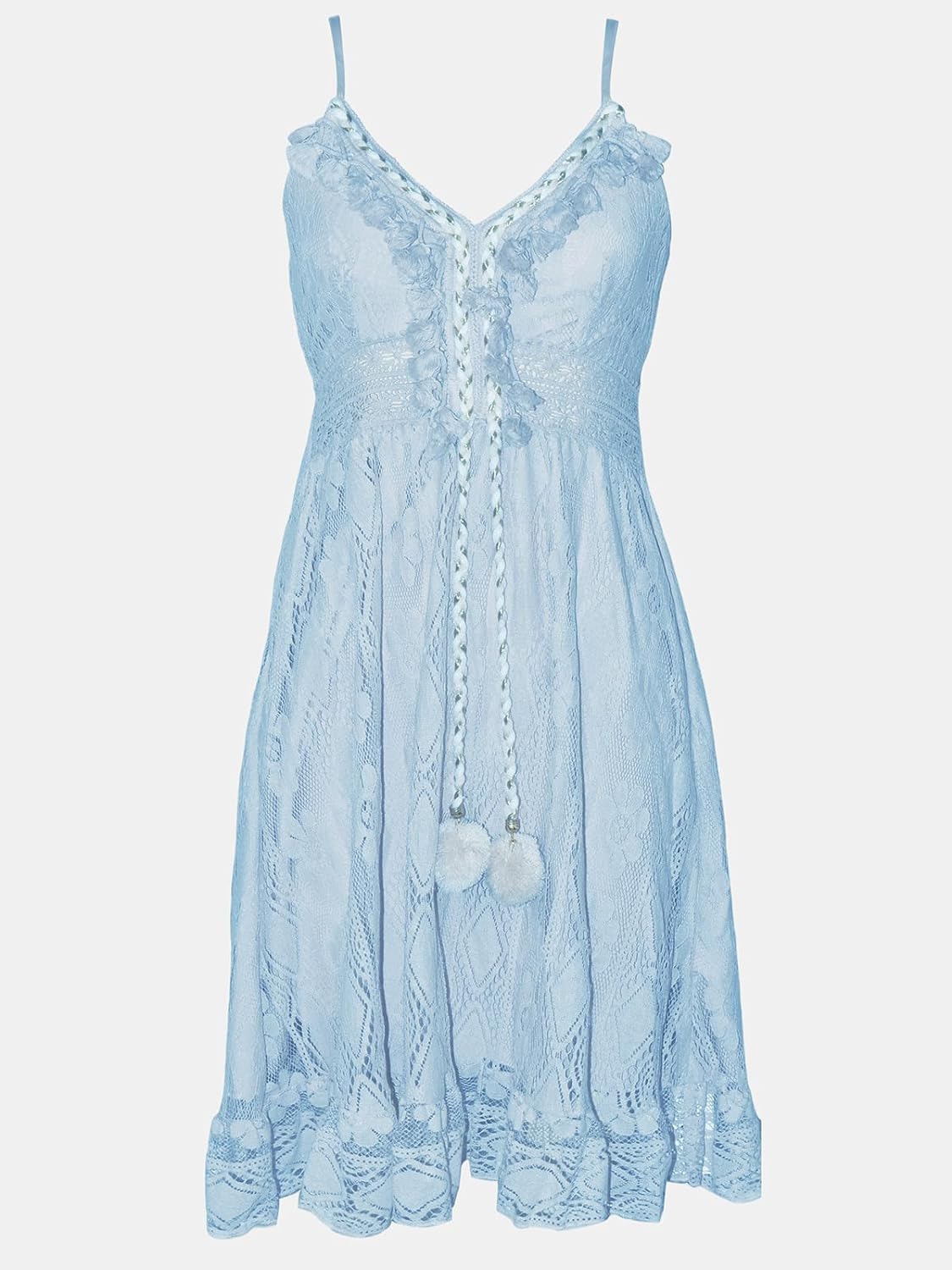 • Entdecken Sie die perfekte Mischung aus femininer Eleganz und trendigem Design mit unserem floralen Spitzenkleid. Dieses bezaubernde Kleid vereint modische Elemente wie einen V-Ausschnitt, Quastenverzierungen und verstellbare Spaghettiträger mit