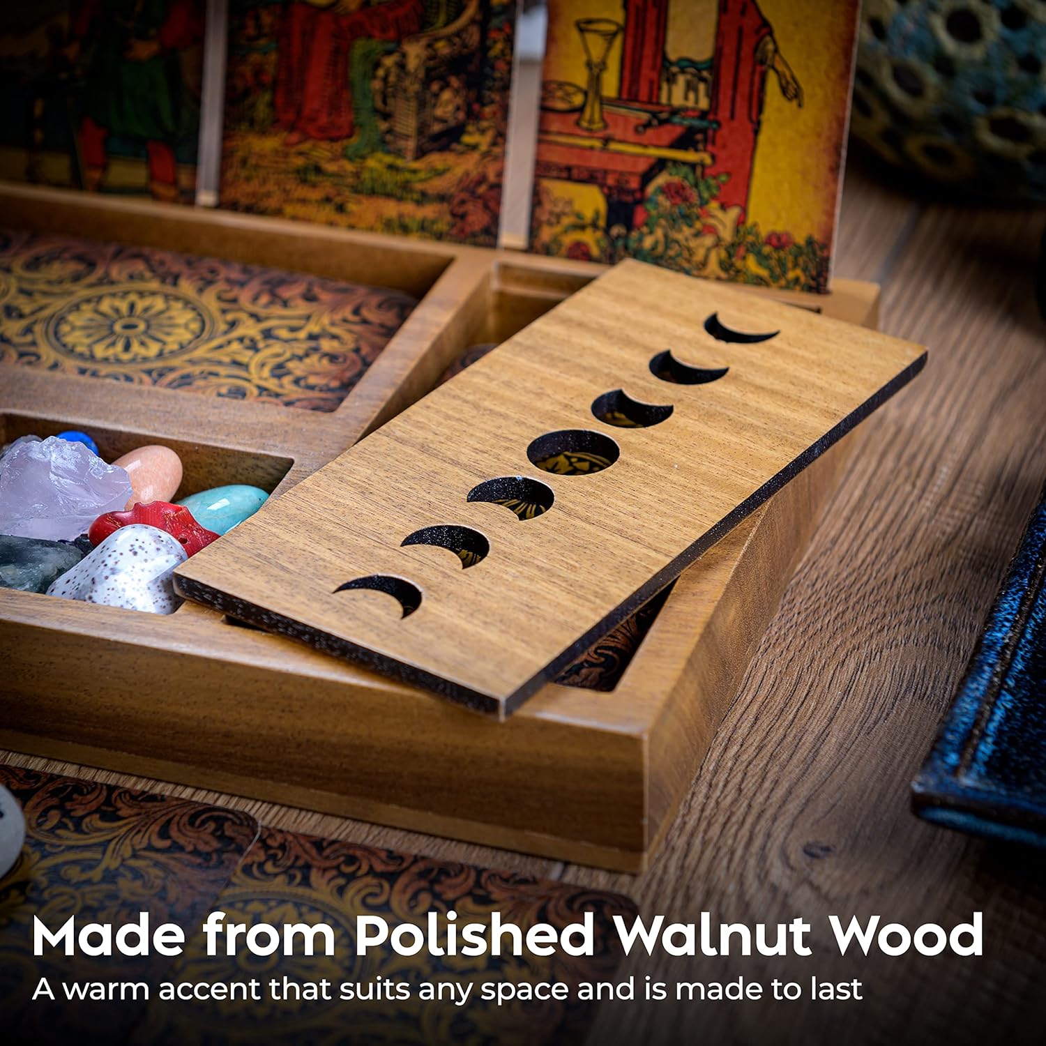 - Nutze mythische Bewegungen – Lade das mächtige Symbol der Wiedergeburt und Transformation in dein Leben ein. Der Deckel dieser Box für Tarot-Zubehör ist mit den verschiedenen Mondphasen geschnitzt. Diese Tarot-Dekorbox ist eine starke Erinnerung an