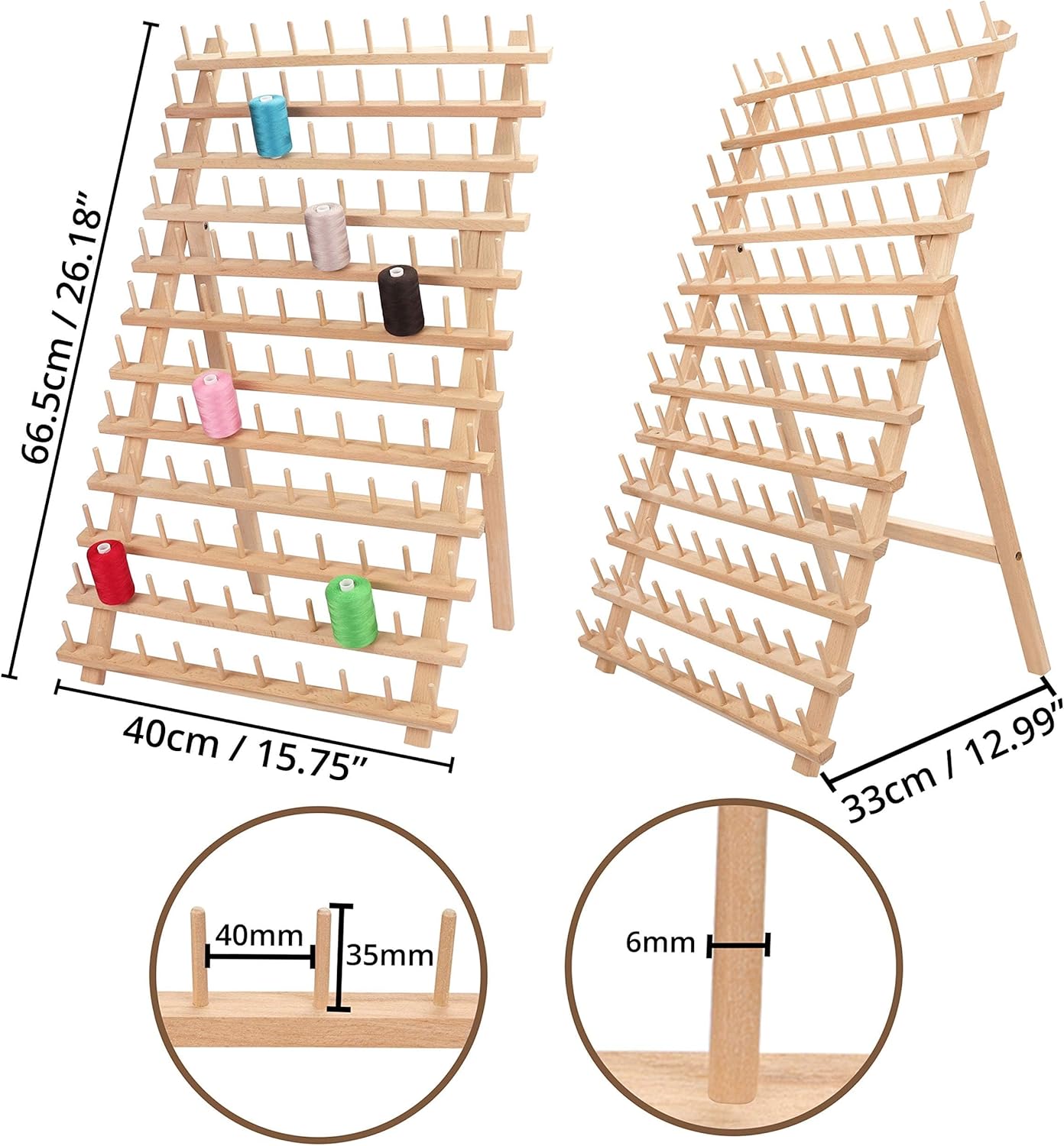 - GARNROLLENHALTER AUS HOLZ: Mit diesem Spulenhalter können Sie all Ihr Nähgarn, Stickgarn oder Faden Rollen ordentlich aufbewahren. Aufgeklappt ist das Regal 40 cm lang x 33 cm breit x 66,5 cm hoch. Jeder Spulen Halter ist 6 mm dick und 35 mm hoch. Der Abstand zwischen jedem Haken ist 40 mm.