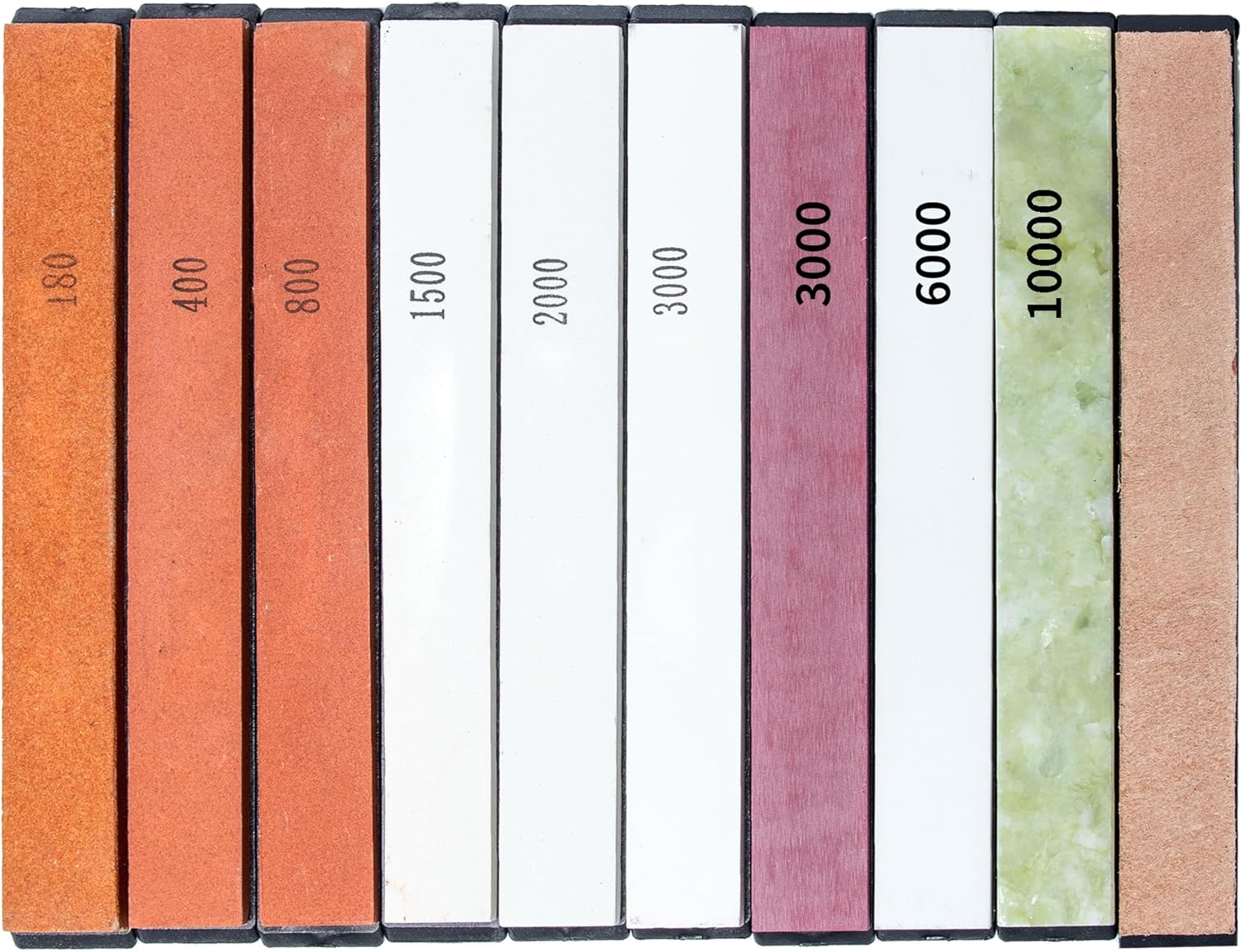 - 9 + 1 einzigartiges Stein-Set – 9 verschiedene Schleifsteine mit Basis: grob (180, 400 Körnung), mittel (800, 1500 Körnung), fein (2000, 2*3000 Körnung), Politur (6000, 10000 Körnung), 1 Leder-Streichriemen für die Fertigstellung der