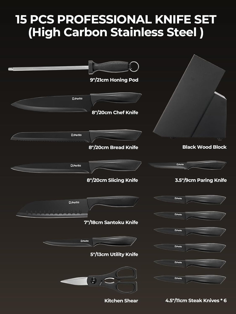 - Messerblock Set für Jeden Küchenbedarf: Der D.Perlla Messerblock ist der ideale Messerblock für Einsteiger und Hobbyköche. Der Set besteht aus einem Messerblock aus holz, einem Kochmesser 20CM, einem Fleischmesser 20CM, einem Brotmesser mit