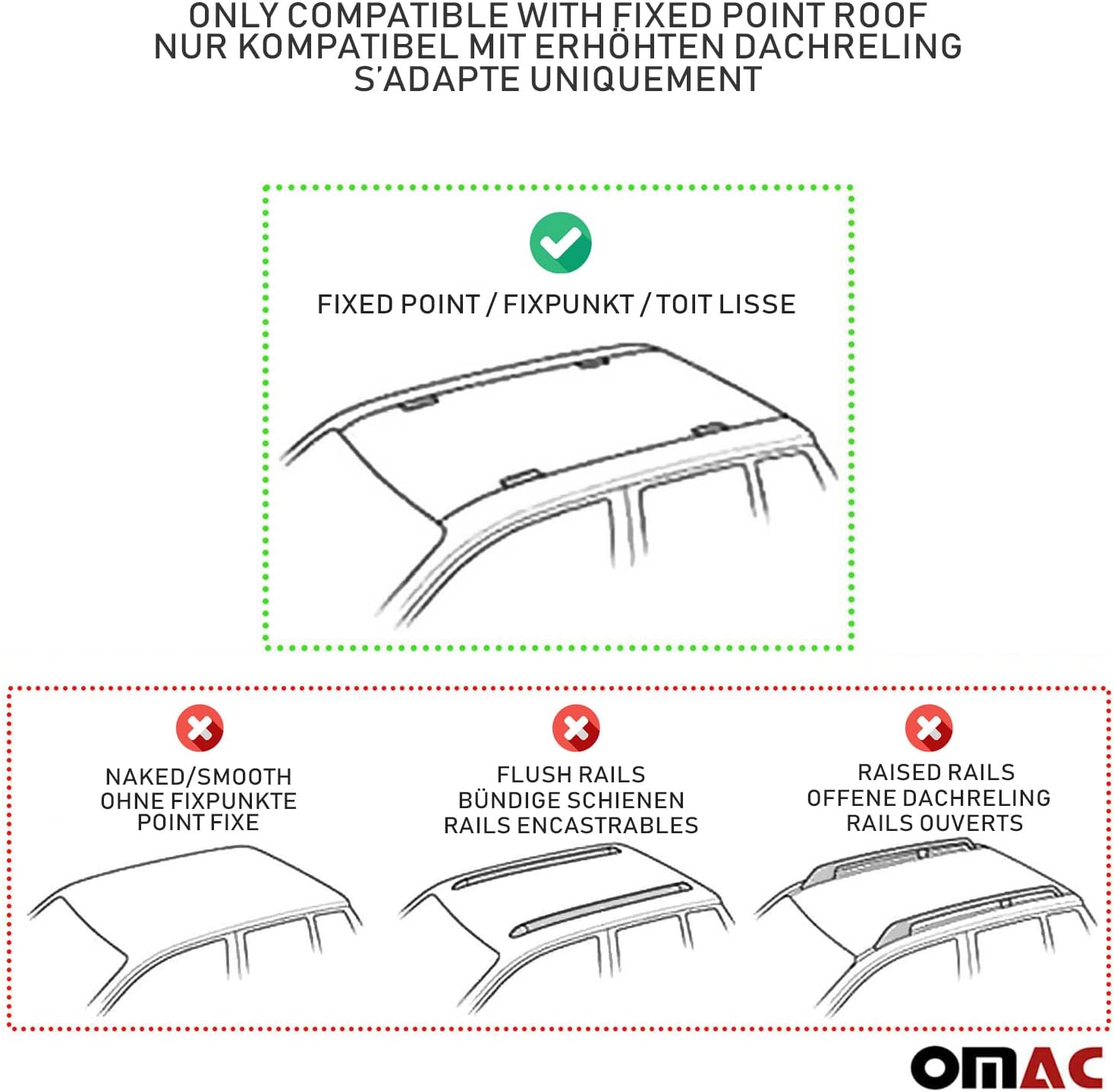 - Dieses Produkt ist nur für Fahrzeuge mit Fixpunkt-Dach geeignet.