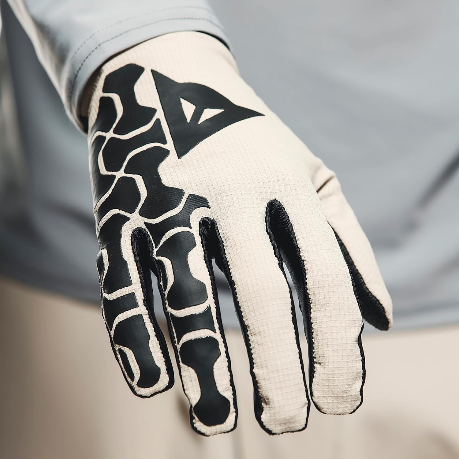 • Hochwiderstandsfähige MTB-Handschuhe mit abriebfesten Einsätzen am Handrücken und Touchscreen-Kompatibilität; Dainese HookButton Verbindungssystem an Dainese HGR-Hose; Handgelenkriemen