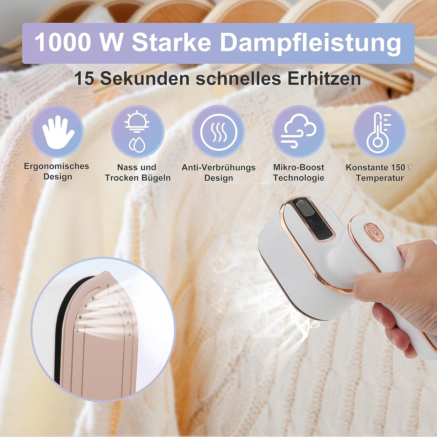 - 【Schnelles Aufheizen in 15 Sekunden】Das Mini Dampfbügeleisen hat eine Leistung von 1000 Watt, die sich in 15 Sekunden schnell aufheizen kann, um bei einer konstanten Temperatur von 150℃ zu bügeln. Viel schneller als herkömmliche Bügeleisen