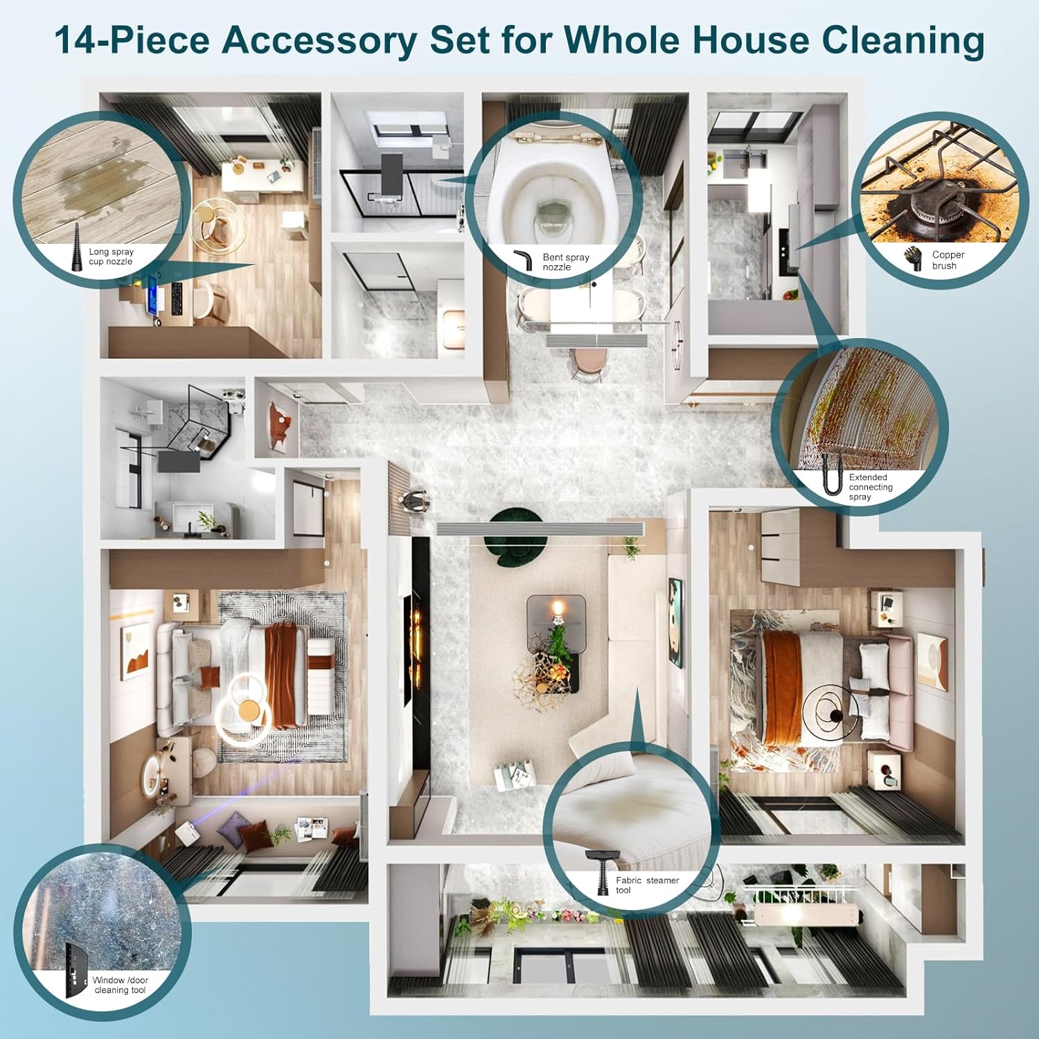 - 【Dampfreiniger für Alles mit 14 Aufsätzen】14 vielseitige Zubehörteile maximieren die Vielseitigkeit des Geräts für die Reinigung verschiedener Oberflächen und schwer erreichbarer Stellen. Der flexible Verlängerungsschlauch eignet sich perfekt
