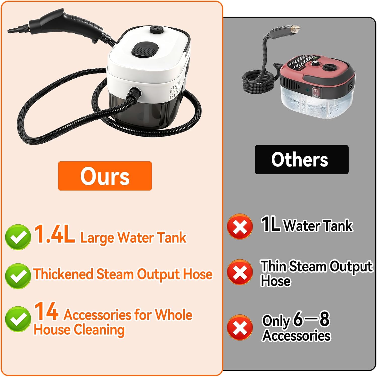 - 1400ml Wassertank: Dieser tragbare Dampfreiniger für den Heimgebrauch verfügt über einen 1400-ml-Wassertank, sodass Sie sich auch ohne Wasserquelle auf die Reinigung konzentrieren können. Eine einzige Nachfüllung reicht für 40 Minuten Betriebszeit.