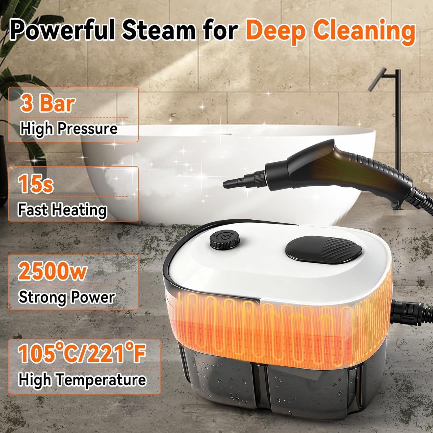 - Hochdruckdampf: Dieser Hochtemperatur-Dampfreiniger verfügt über eine Leistung von bis zu 2500 Watt und erzeugt in nur 15 Sekunden Hochtemperaturdampf mit ca. 100 °C und 3 bar Druck. So entfernt er effektiv und gründlich hartnäckiges Fett, Schmutz,