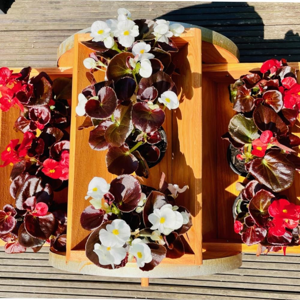 • Freistehendes Holz Blumenrad mit 3 Kästen (ohne Blumendekoration).