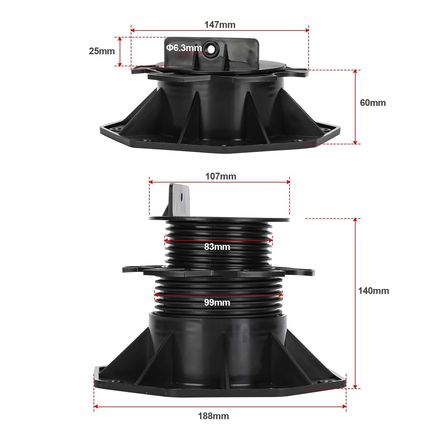 - 🏡【Hohe Tragfähigkeit】Stufenlose Höhenverstellung von 60-140 mm, Die einer hohen Last von mindestens 1700kg standhalten kann. Einem Auflageflächendurchmesser von 107 mm - Fussdurchmesser von 188 mm, Somit ist die optimale Stabilität