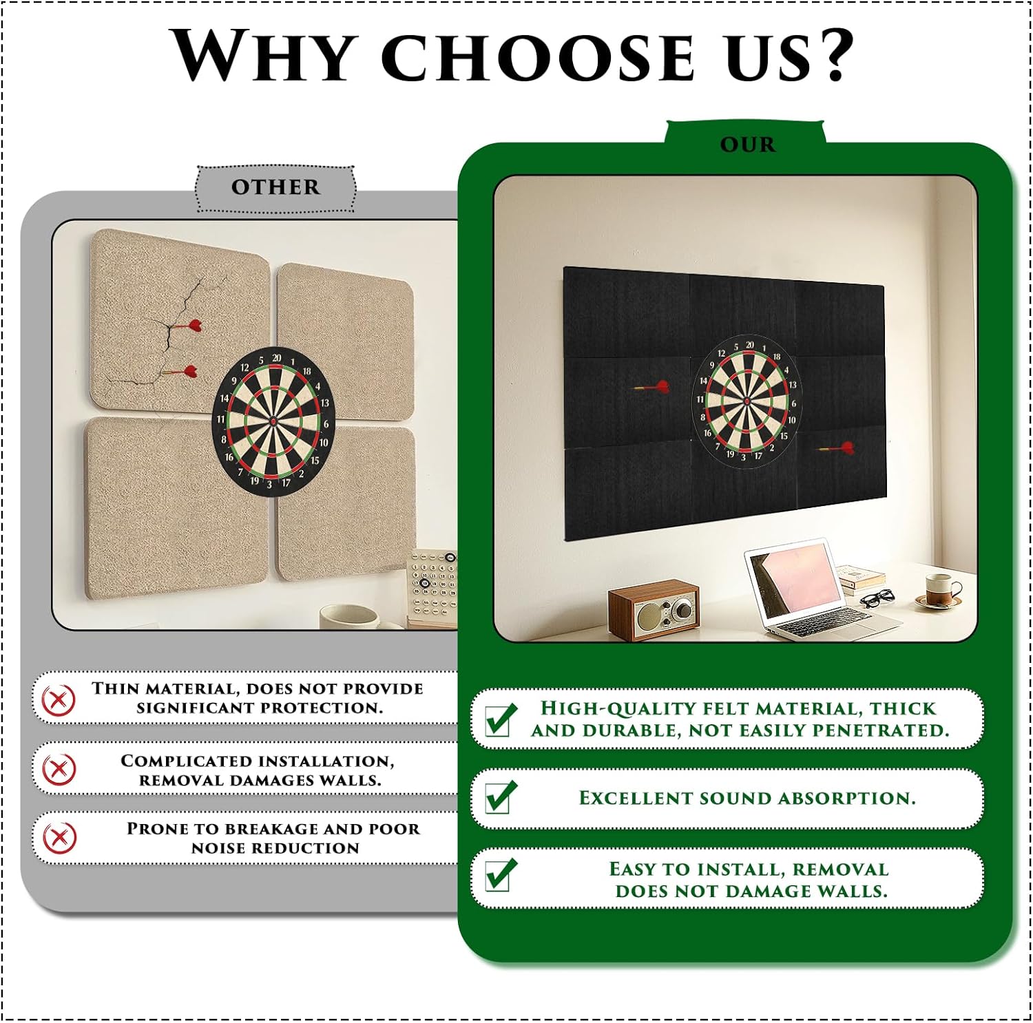 - 🎯SCHUTZ FÜR WÄNDE UND DARTS: Unsere Dartscheibe Schutzwand besteht aus 9 Hochwertigen Filzplatten mit einer Dicke von 1,5 cm. Sie Gewährleistet eine Optimale Abdeckung, Schützt Wände und Dartspitzen vor Beschädigungen durch Aufprall und verfügt