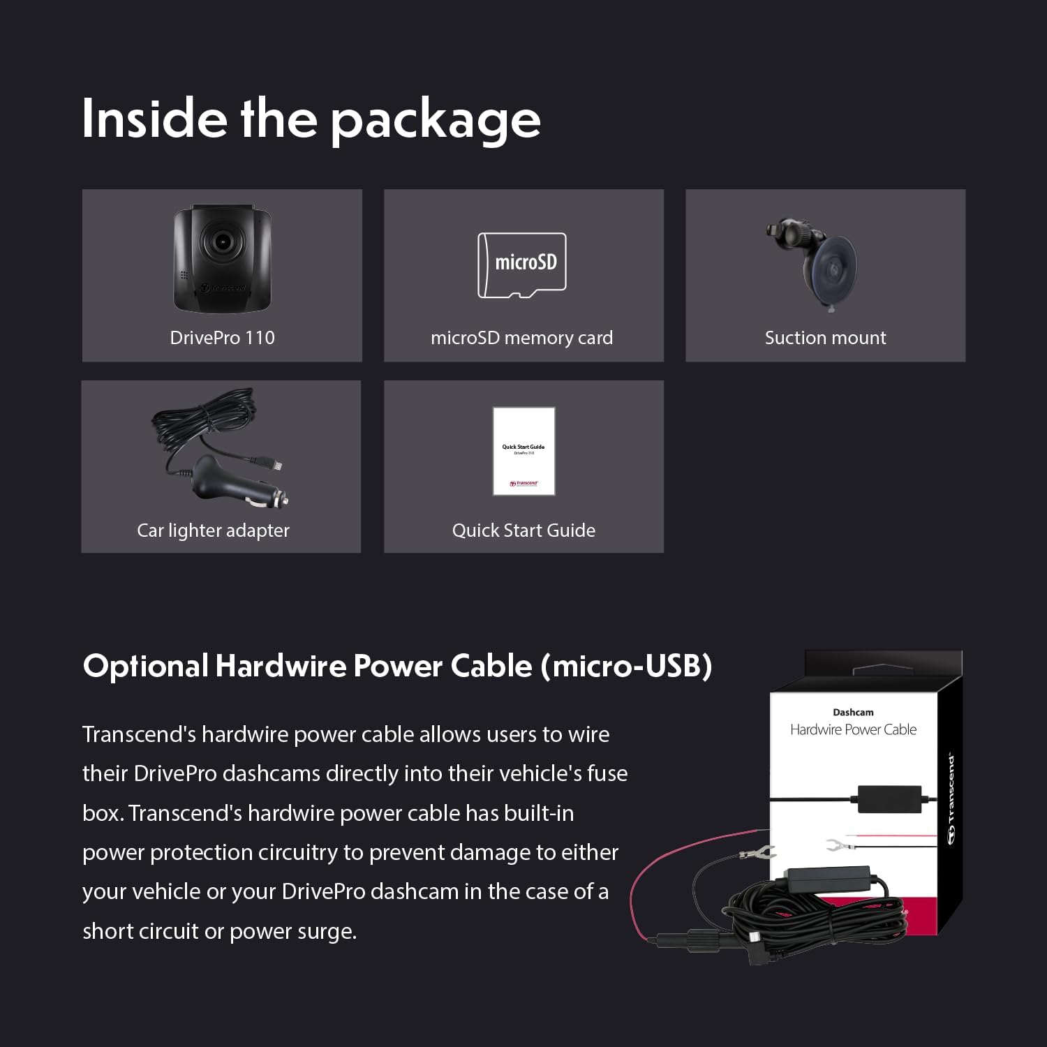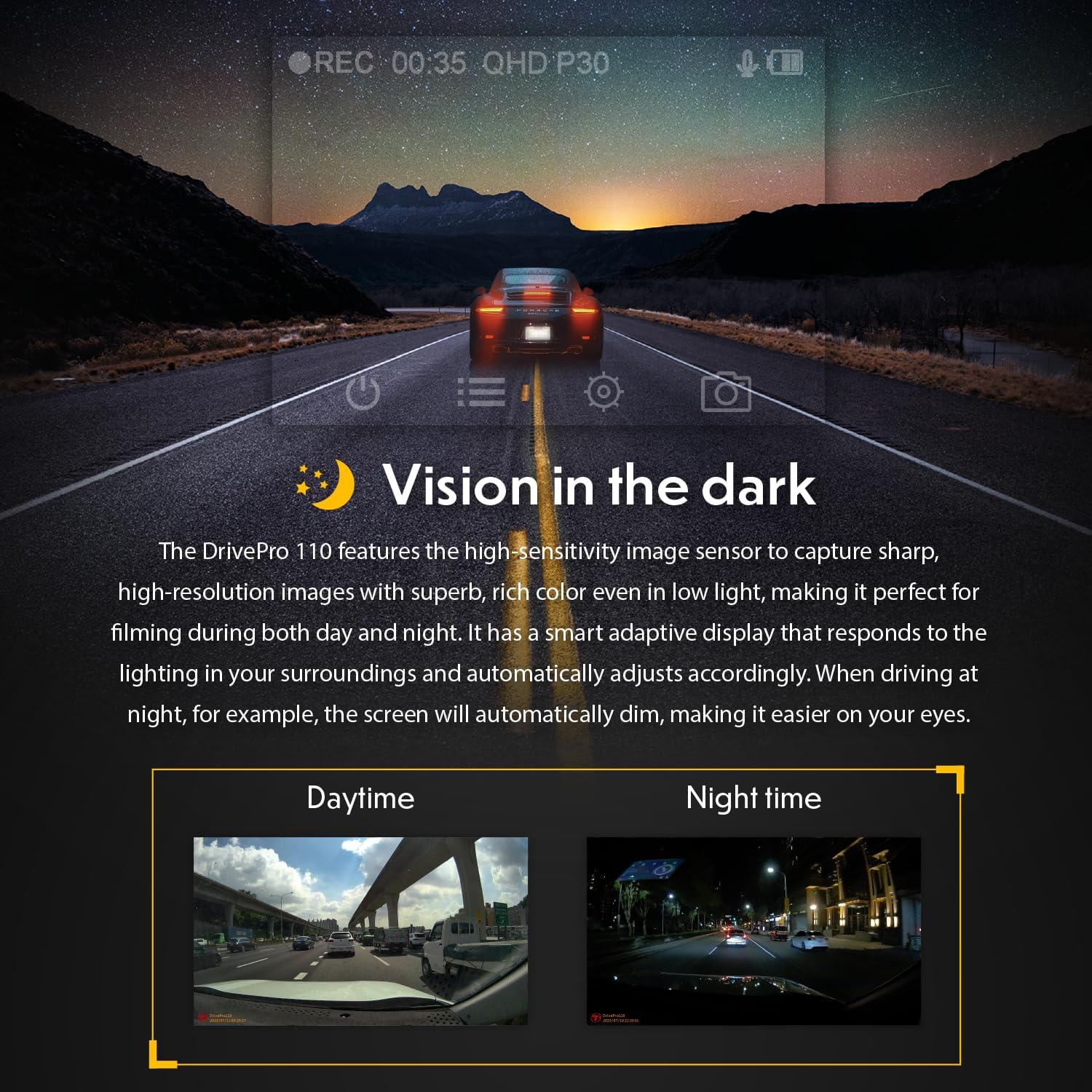 - Die DrivePro 110 Dashcam verwendet einen hochempfindlichen Bildsensor, um auch bei schlechten Lichtverhältnissen hochauflösende Bilder mit extrem feiner Tonwertabstufung zu liefern. Darüber hinaus verfügt der DrivePro 110 über ein Display mit