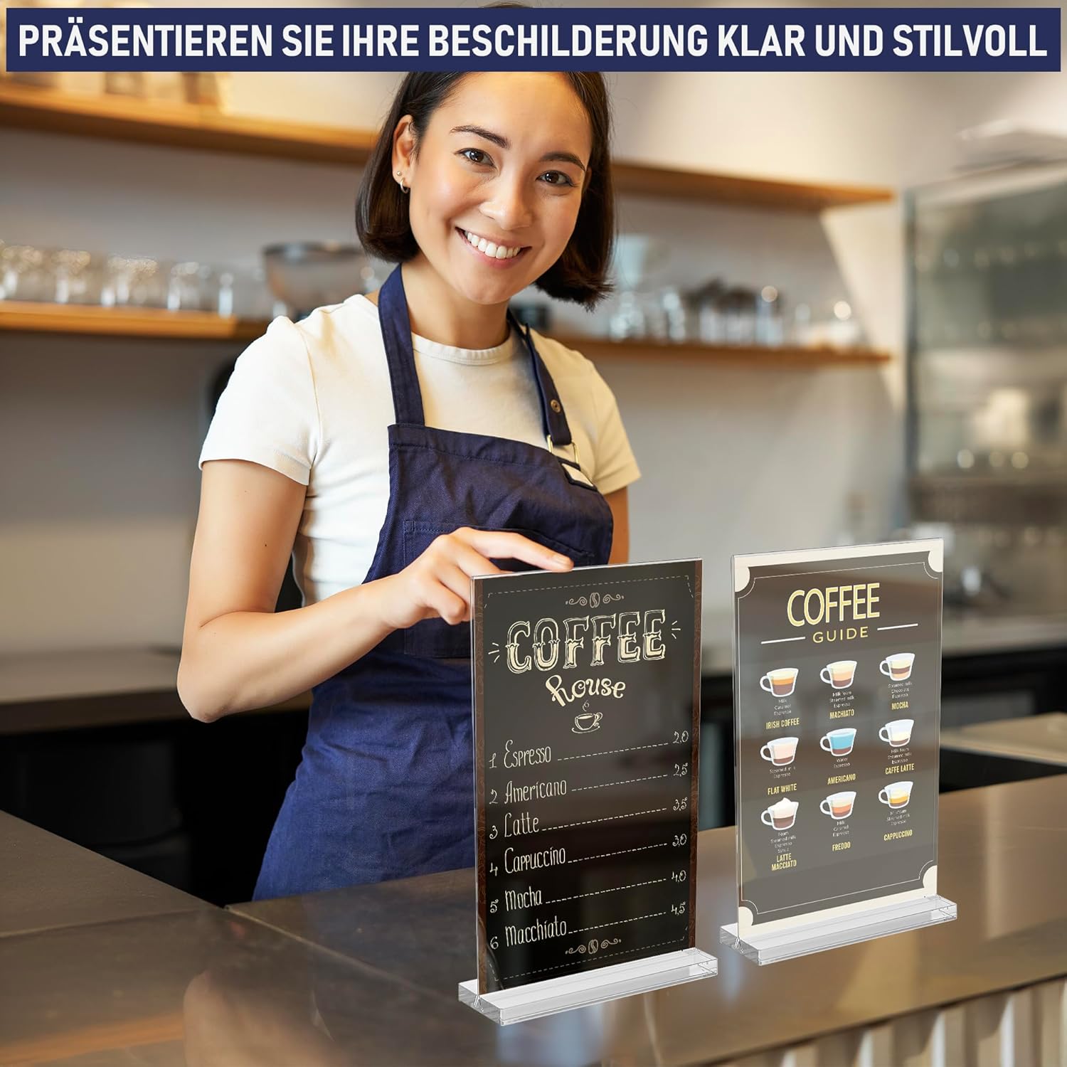 - Müheloser Wechsel von Fotos und Schildern: Das benutzerfreundliche Design des Rahmens ermöglicht schnelle Aktualisierungen von Fotos und Schildern. Die stabile 8 mm Acrylbasis hält den Rahmen sicher und lässt ihn dennoch leicht hinein- und