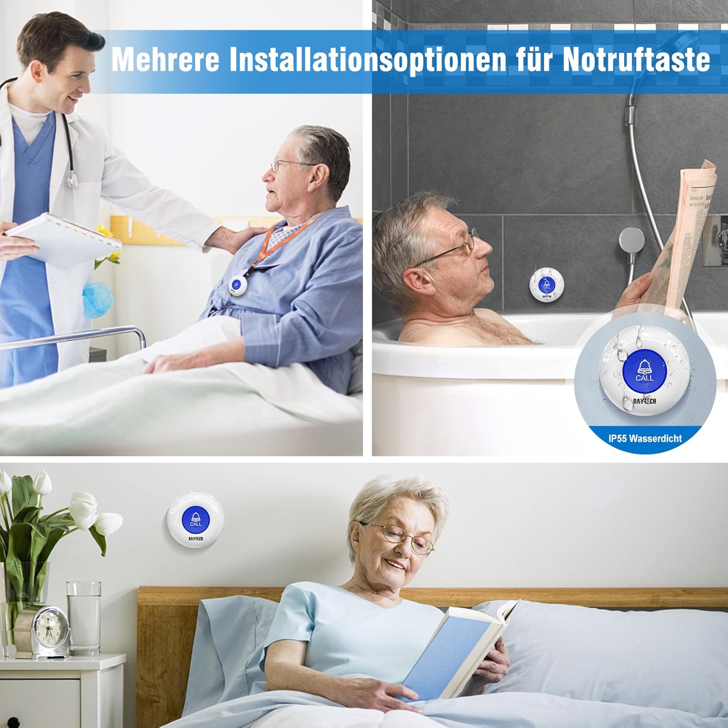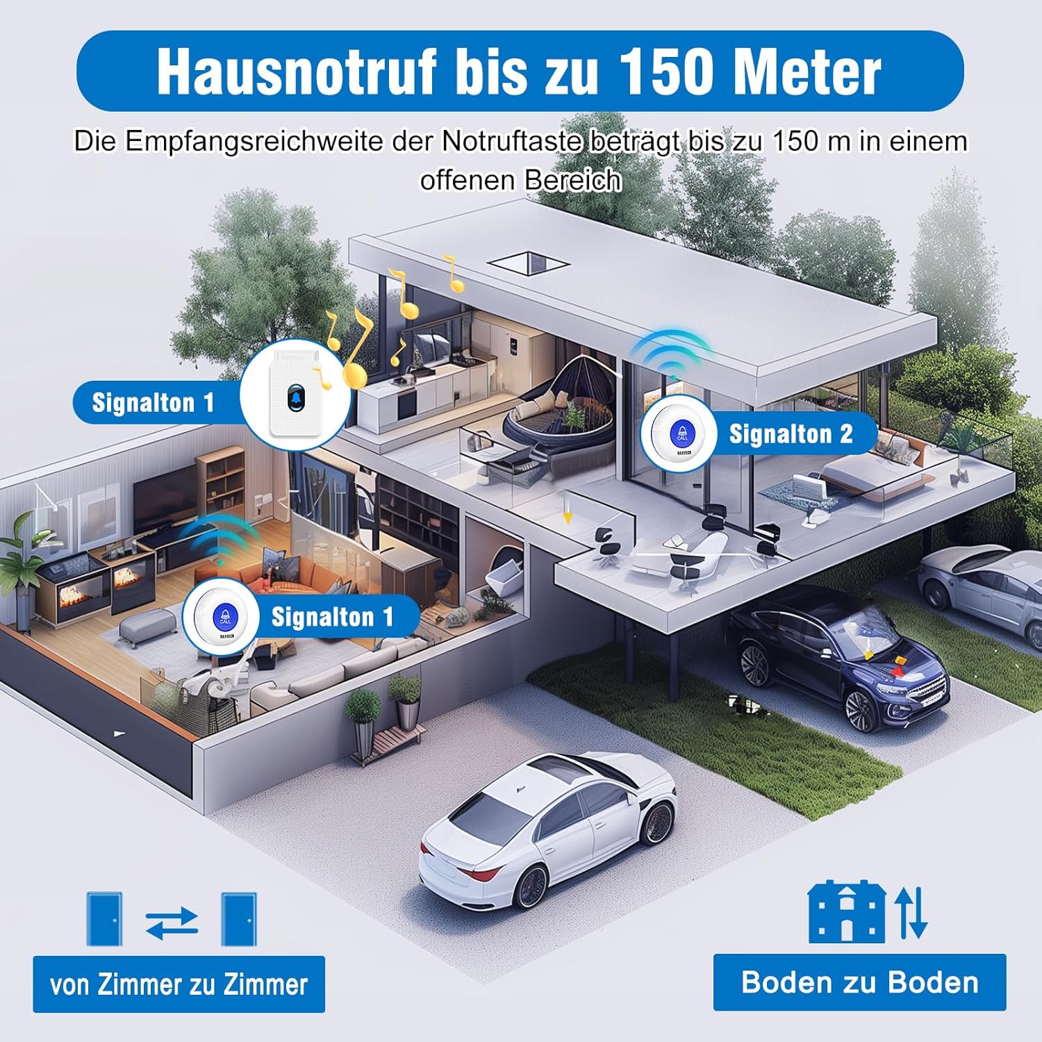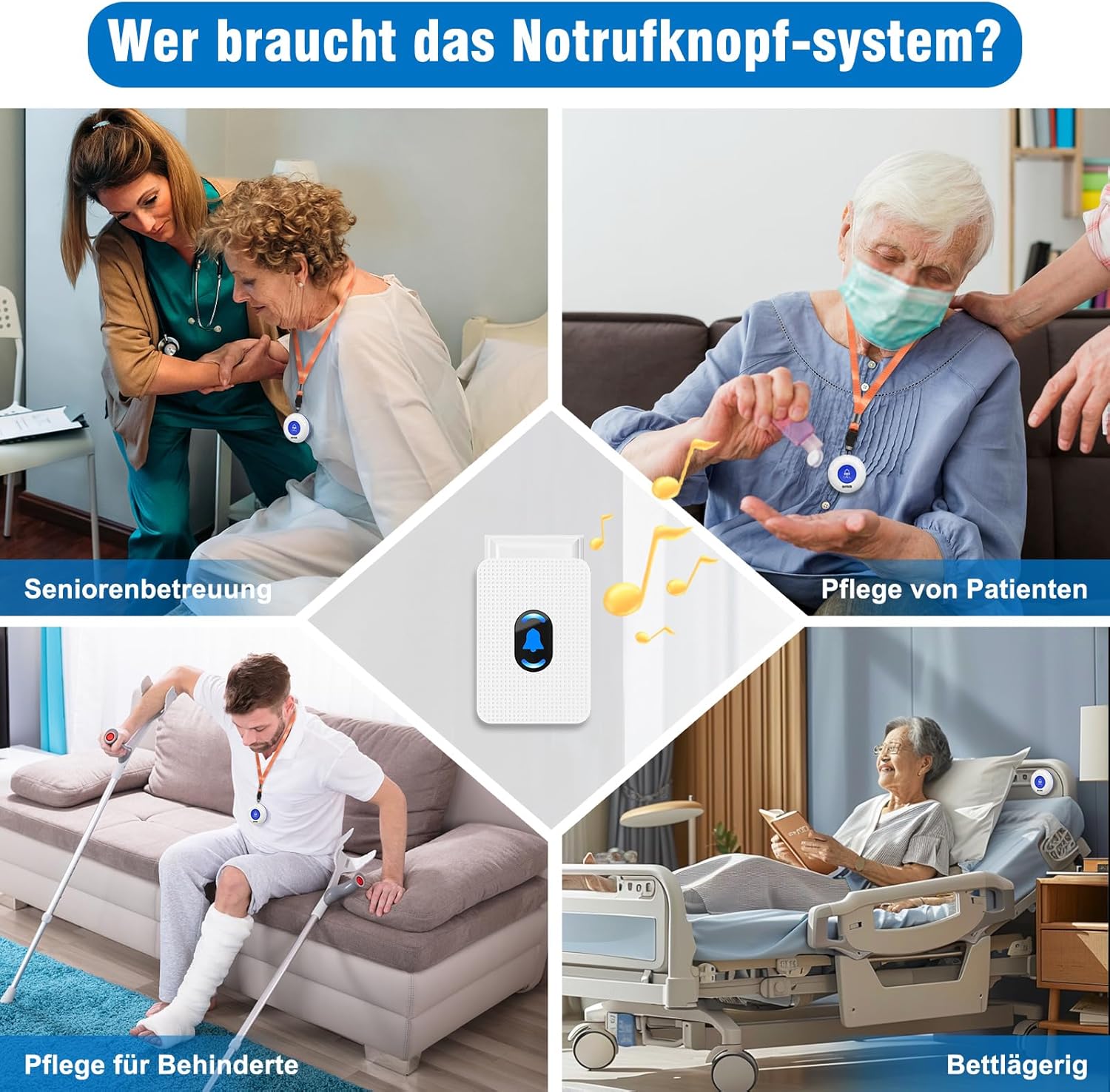 - 【Home Reichweite】 Die notklingel für senioren Reichweite beträgt 500+ Fuss im offenen Bereich,Kann durch die Wand gehen,Wenn Familienmitglieder irgendwo im Haus einen Knopf drücken, kann der Empfänger das Signal empfangen.