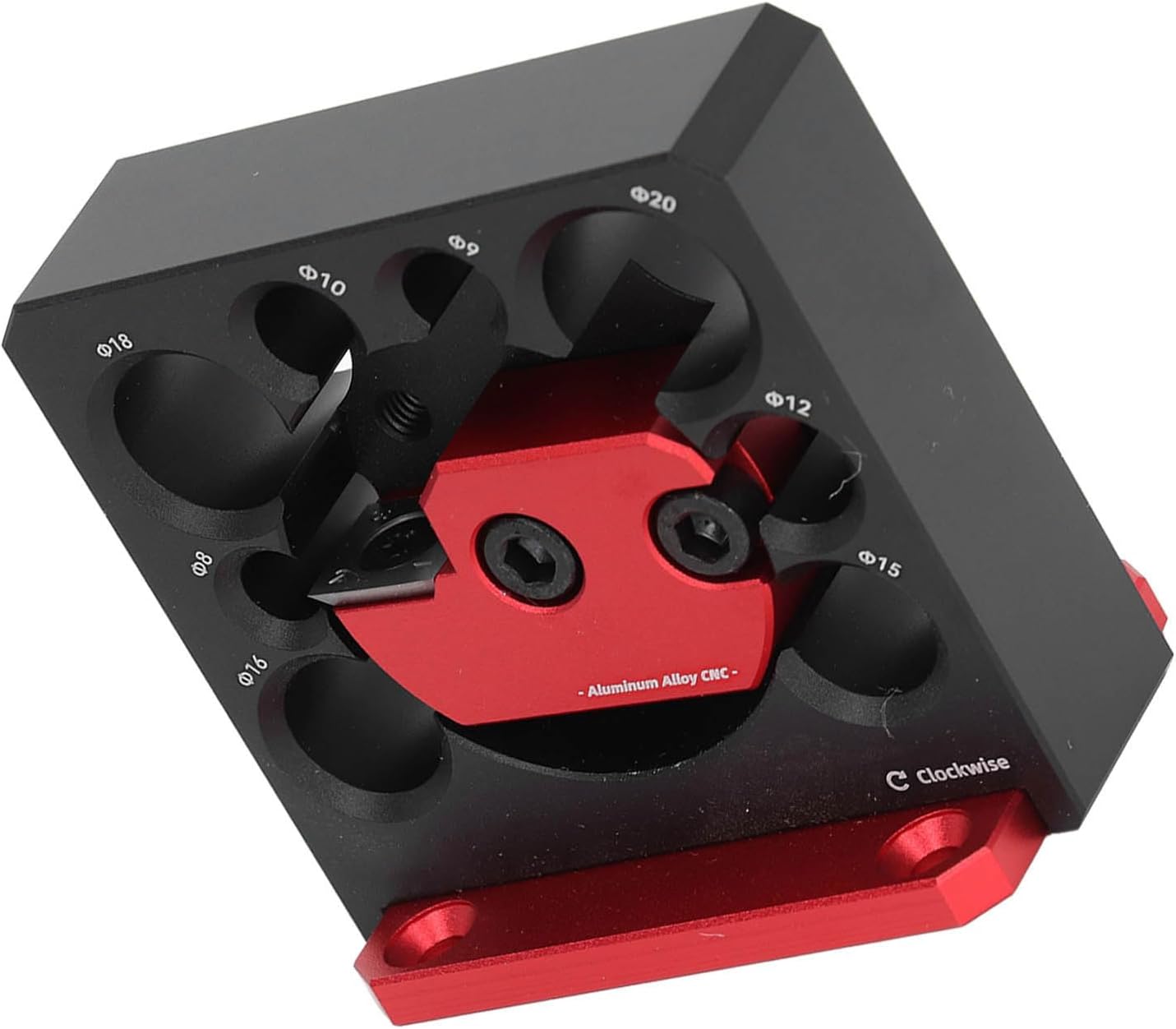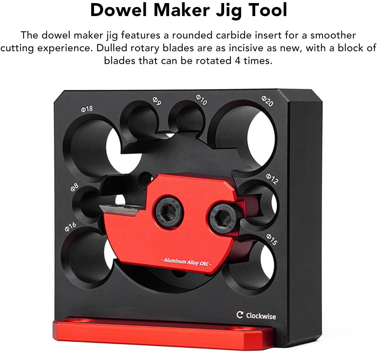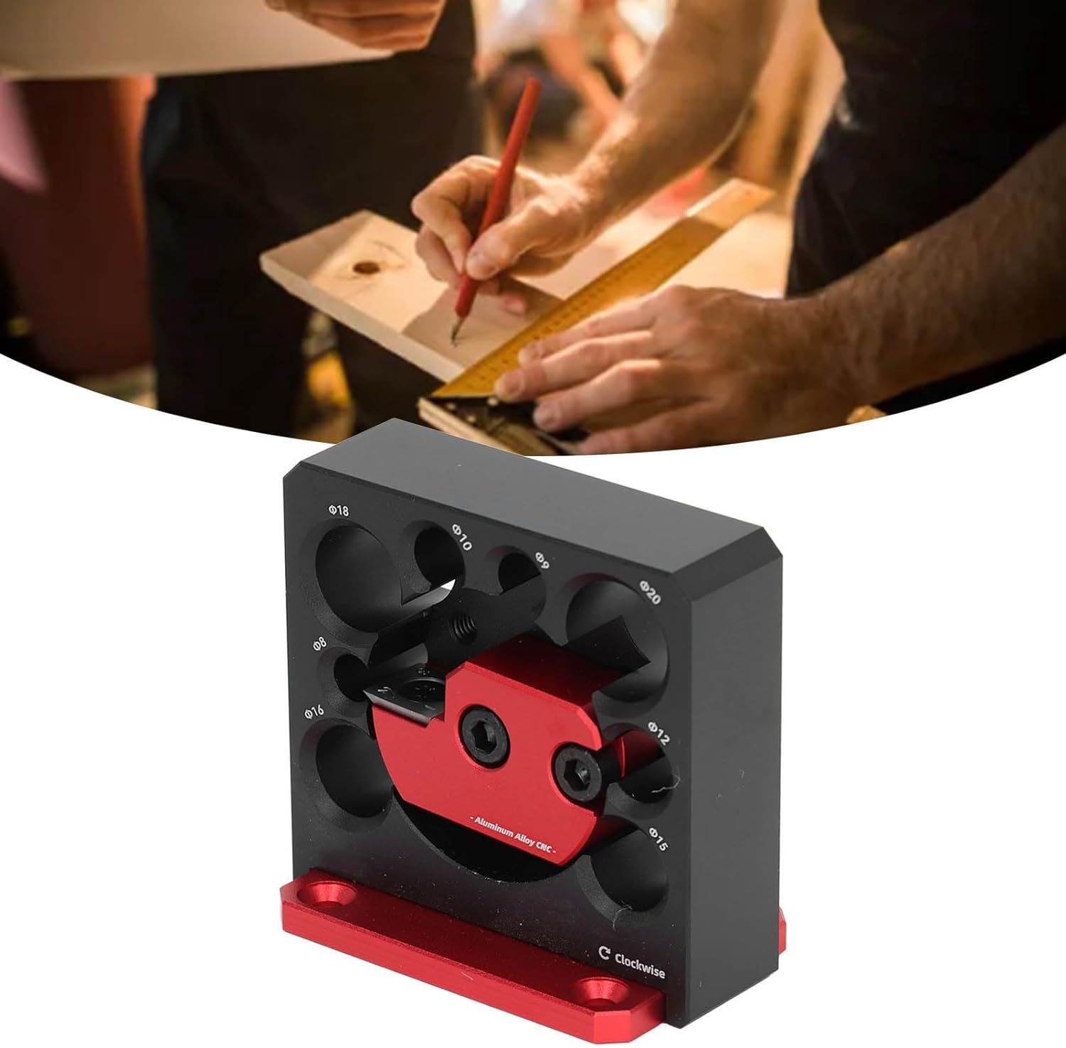 - 8 Drehlöcher: Die Dübelherstellungslehre verfügt über 8 Drehlöcher mit unterschiedlichem Durchmesser. Lösen Sie die Schraube und drehen Sie den roten Halter auf den gewünschten Durchmesser, ziehen Sie die Schraube wieder fest und schon kann es