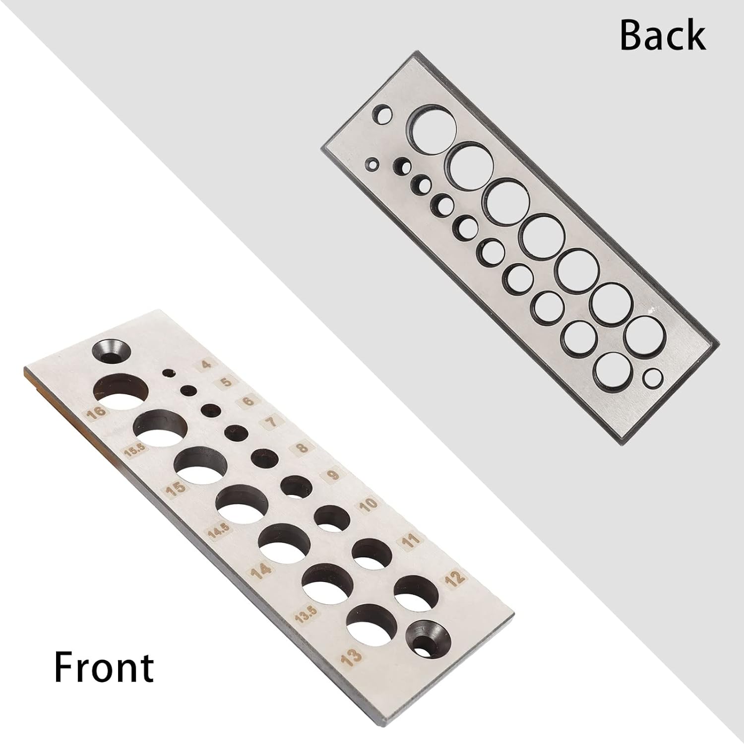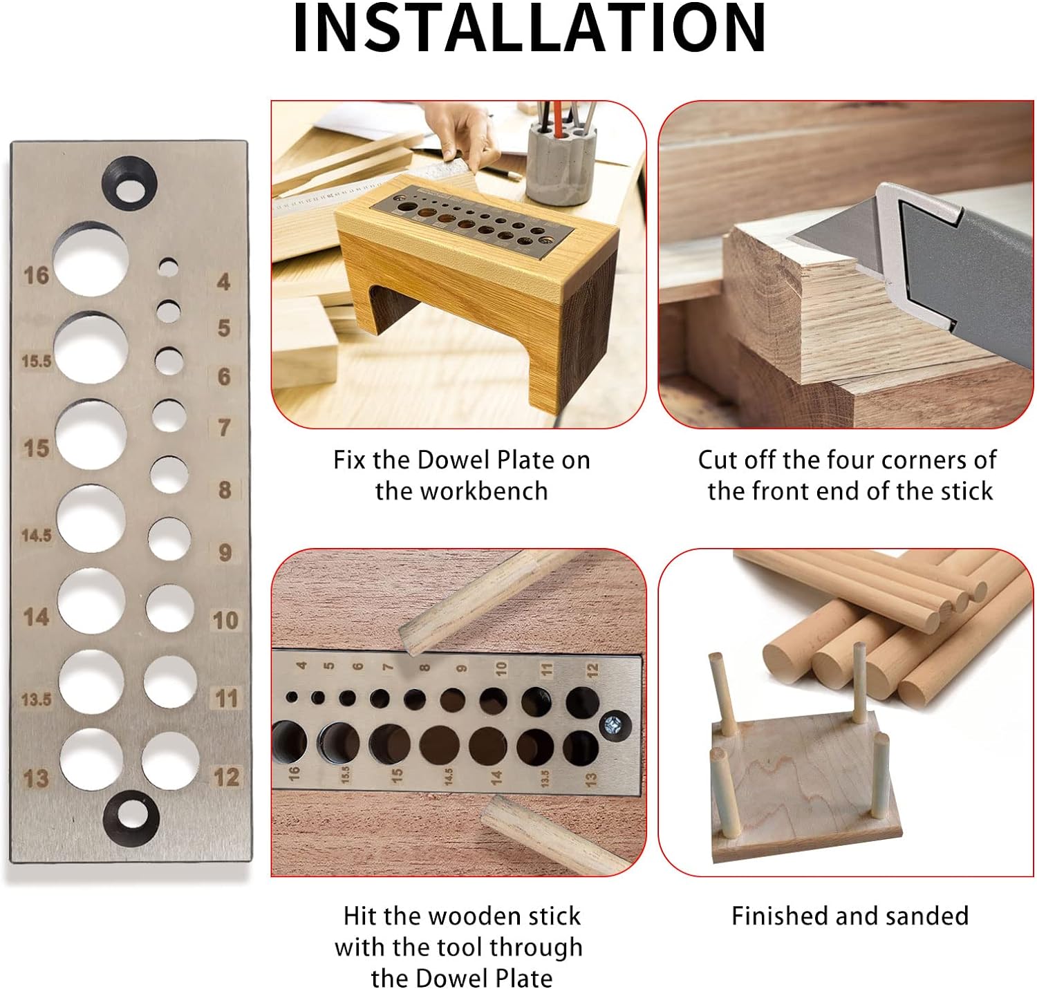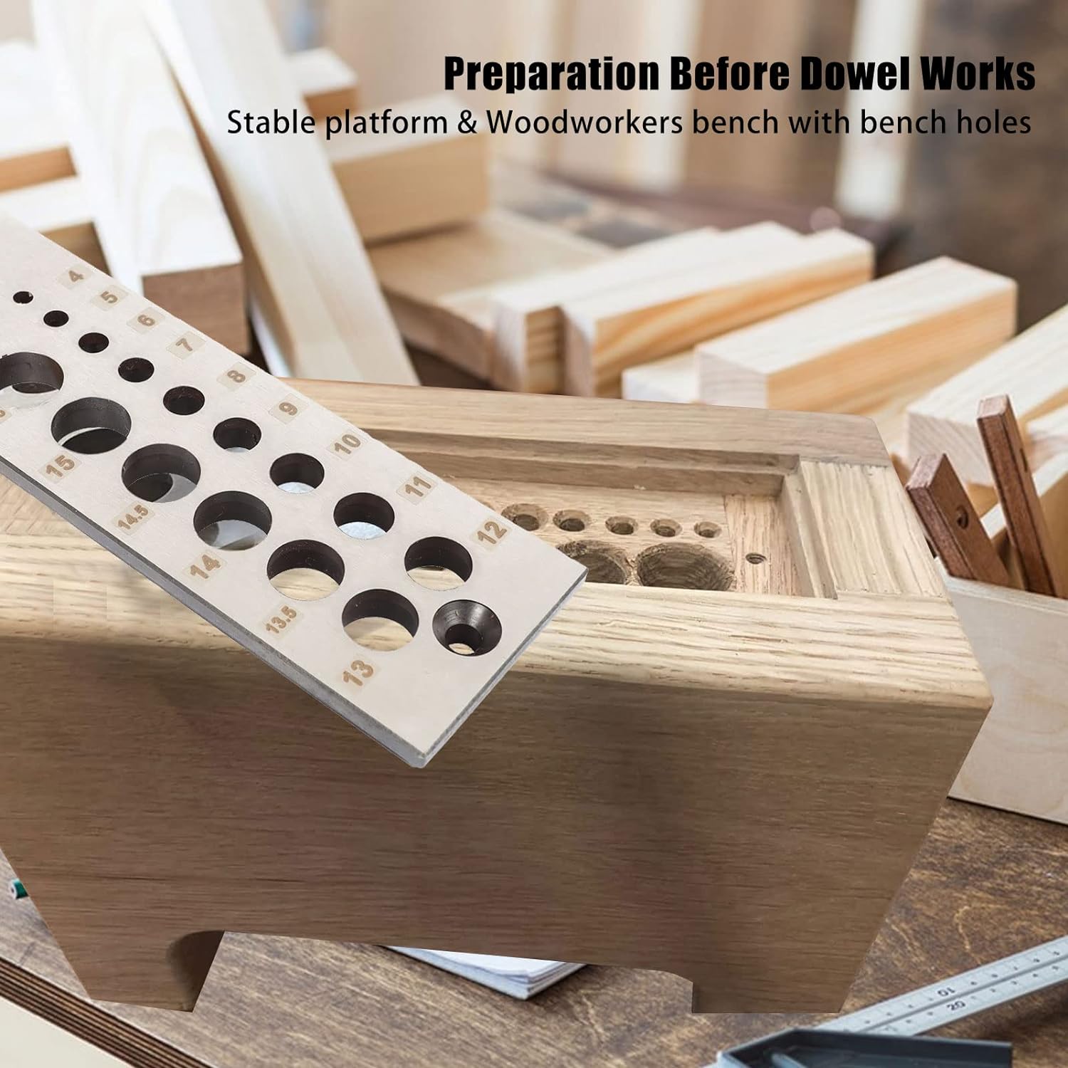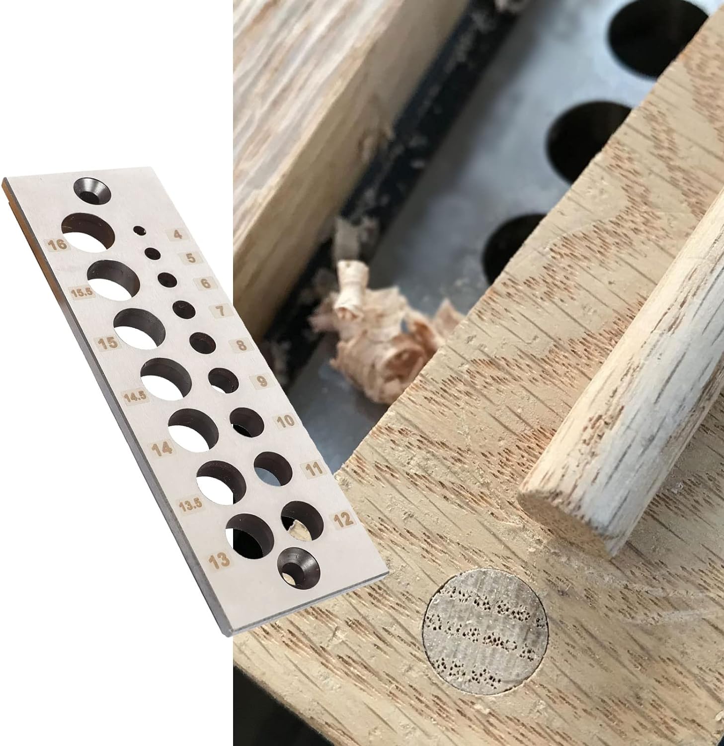 - Spezifikationen: Holzdübel mit 16 Löchern, verschiedene Grössen von 4 mm bis 16 mm, die enthält: 4 mm, 5 mm, 6 mm, 7 mm, 8 mm, 9 mm, 10 mm, 11 mm, 12 mm, 13 mm, 13,5 mm, 14 mm, 14,5 mm, 15 mm, 15,5 mm, 16 mm.