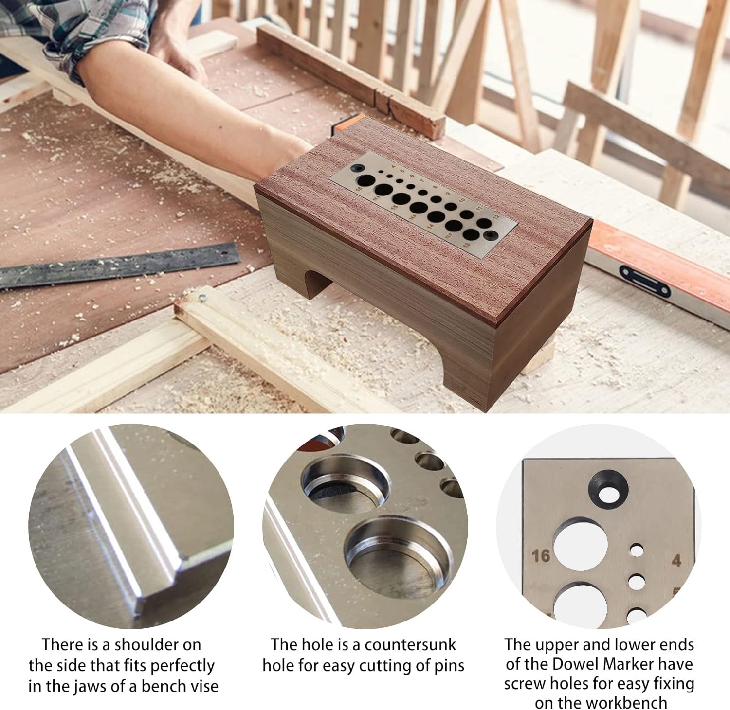 - Praktisches Design: Beide Enden des Dübelmachers sind mit Schraublöchern zur einfachen Befestigung auf der Werkbank reserviert; Der Durchmesser der Unterseite der Löcher ist grösser, was die Reibung reduzieren kann, wenn die Stifte durch jedes Loch