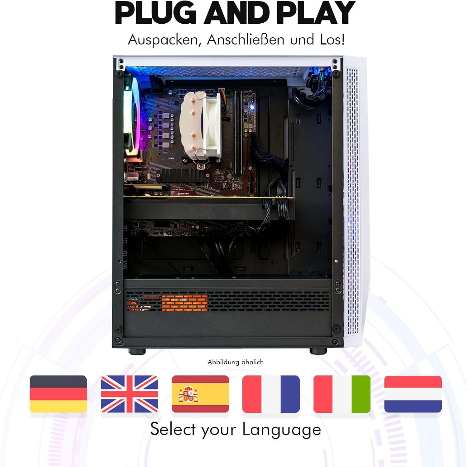 • Individuelle Farbgestaltung möglich - Das Gehäuse ist weiss mit einer RGB Beleuchtung, sowie einem RGB-LED-Lüfter. Die Beleuchtung kann über die RGB Steuerung am PC geändert oder ausgeschaltet werden
