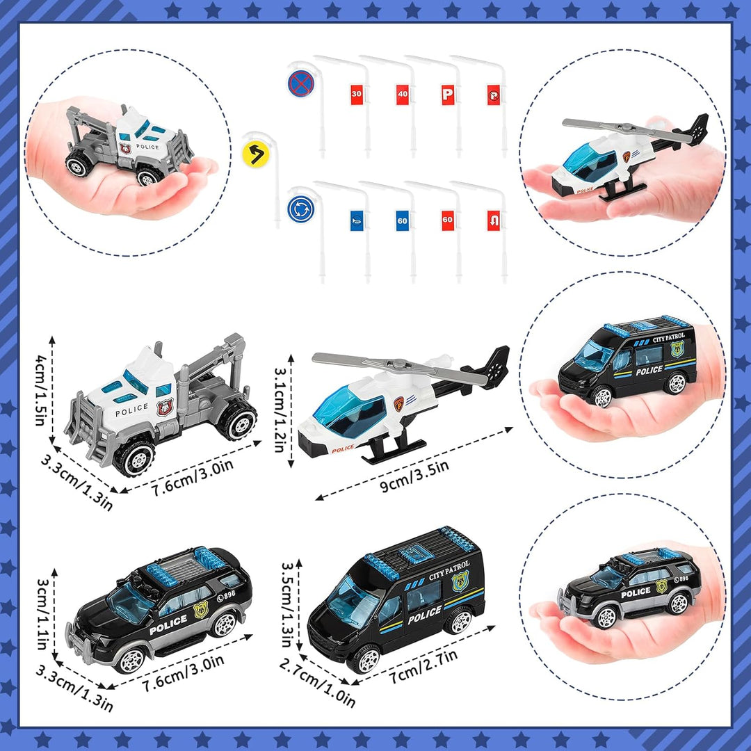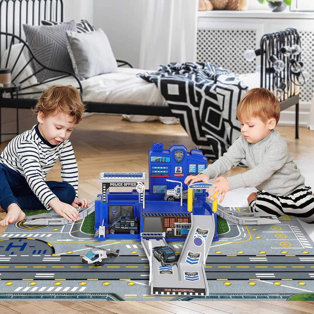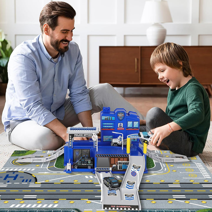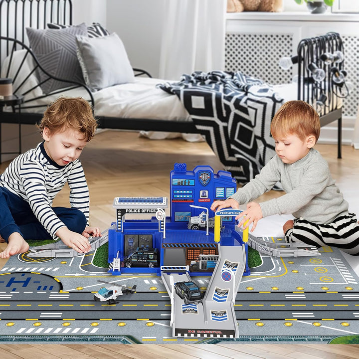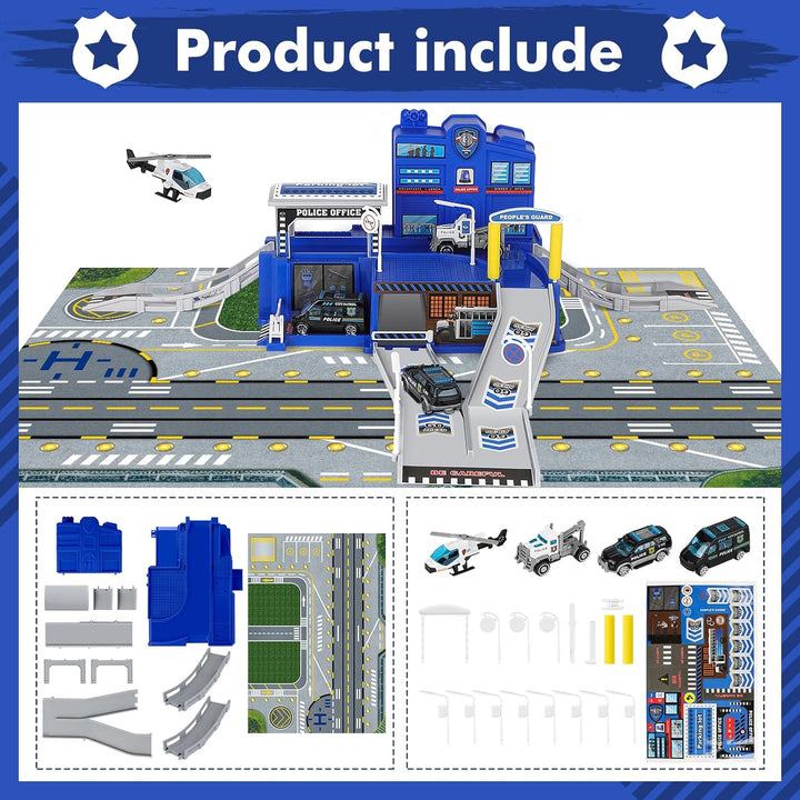 - 【Polizeistation Playset Toys】deAO Polizeiauto-Parkplatz-Spielset mit 3 Polizei-LKWs und 1 Hubschrauber, Infrastruktur als Autoparkplatz, Rampen, Strassenlaternen, Tankstellen und verschiedene gemeinsame Verkehrszeichen. Lassen Sie die Kinder Spass in