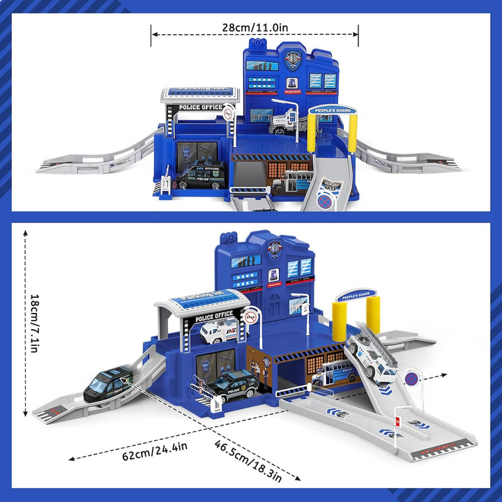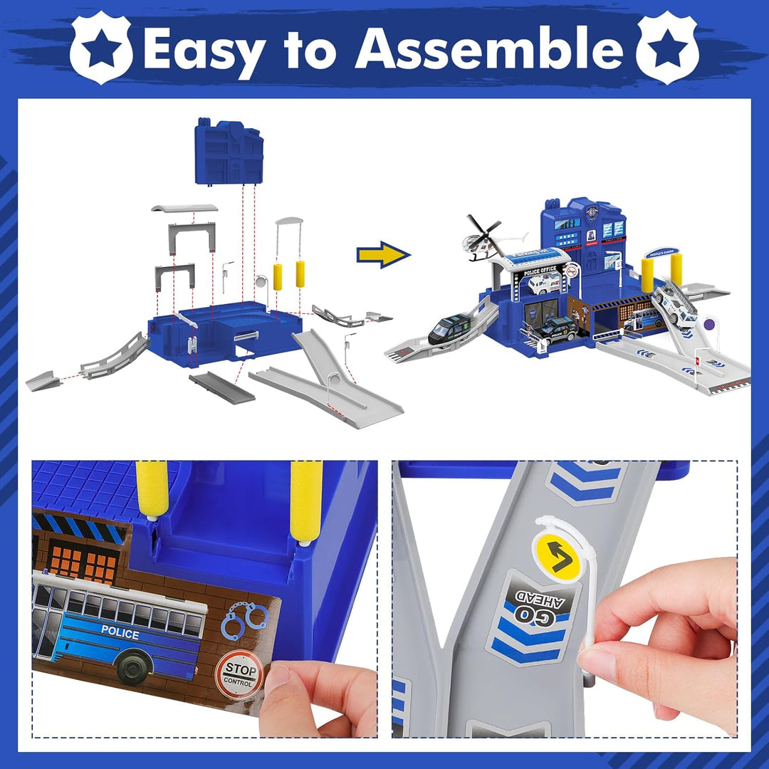 - 【Easy to Assemble Toy Garage】Simply follow the step-by-step instructions in the pictures to put the garage parts together to get a police station garage, and place the signposts according to your scenario plan. Es dauert weniger als fünf Minuten, um