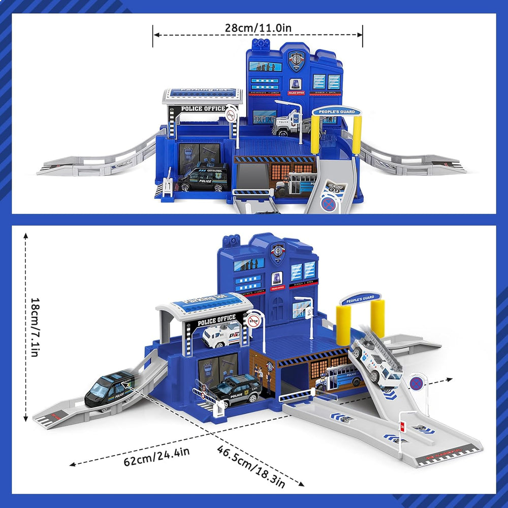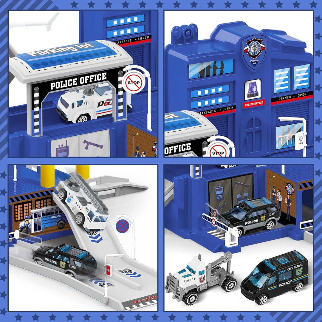 - 【 Hochwertige Materialien für Kinder】Polizeiparkplatz Spielzeug aus kinderfreundlichem ABS-Kunststoff, ungiftig und langlebig, um diese Polizeistation Garage Spielzeug sicher für Kinder zu machen. Das Polizeifahrzeug und der Hubschrauber sind